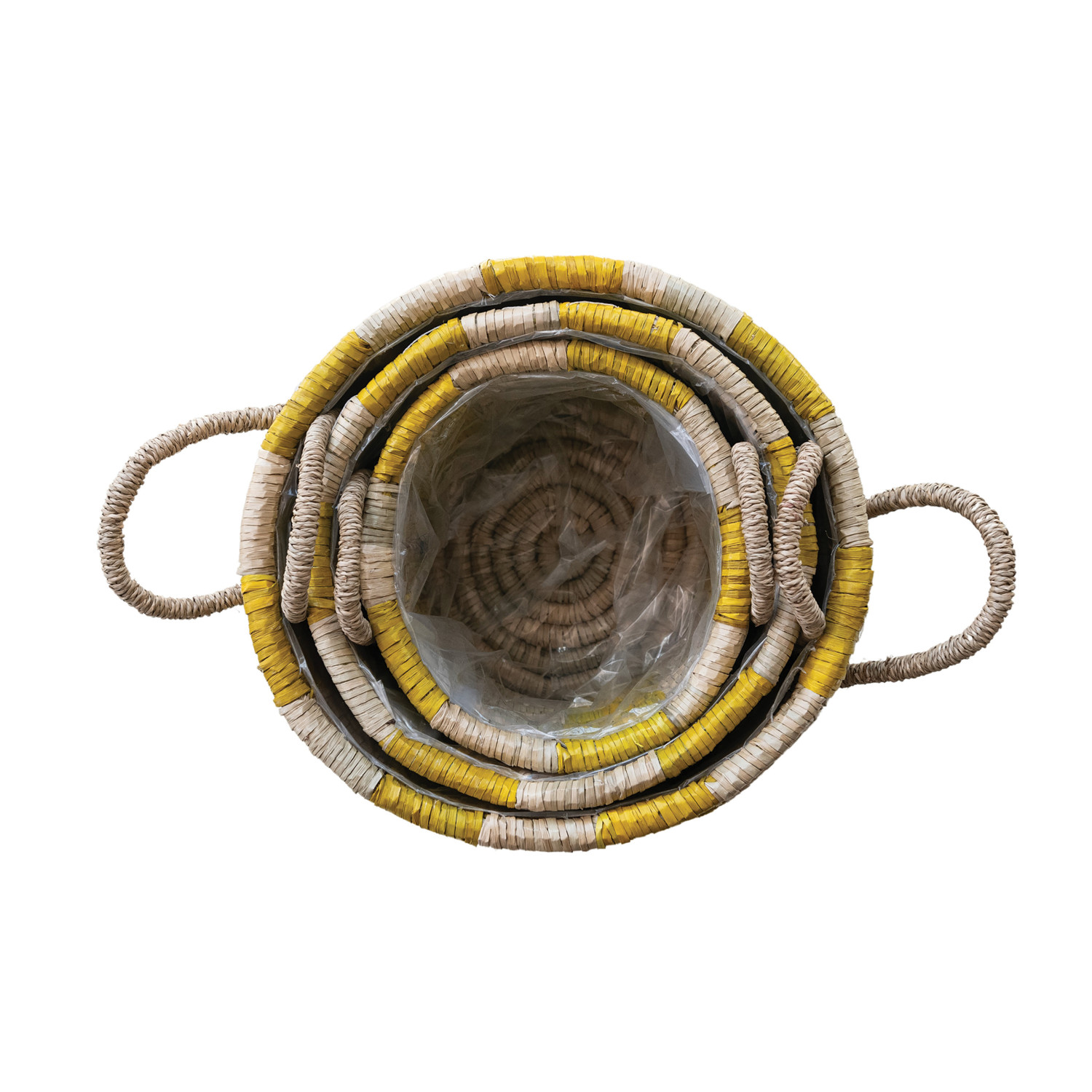 Catalog Name: 13" Round x 12"H, 11" Round x 11"H & 9" Round x 8-1/2"H Hand-Woven Seagrass Striped Baskets w/ Handles & Plastic Liners, Natural & Yellow, Set of 3