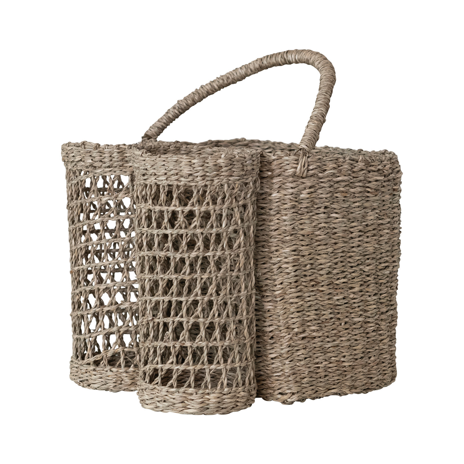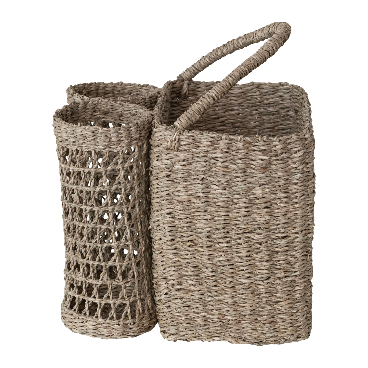 Catalog Name: 10"L x 10"W x 14-1/4"H Hand-Woven Seagrass Basket w/ Handle & Bottle Holders, Natural (Holds 2 Bottles)