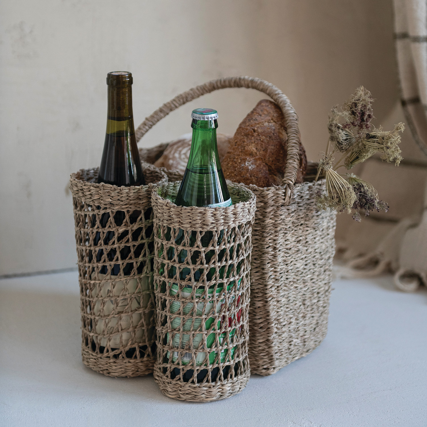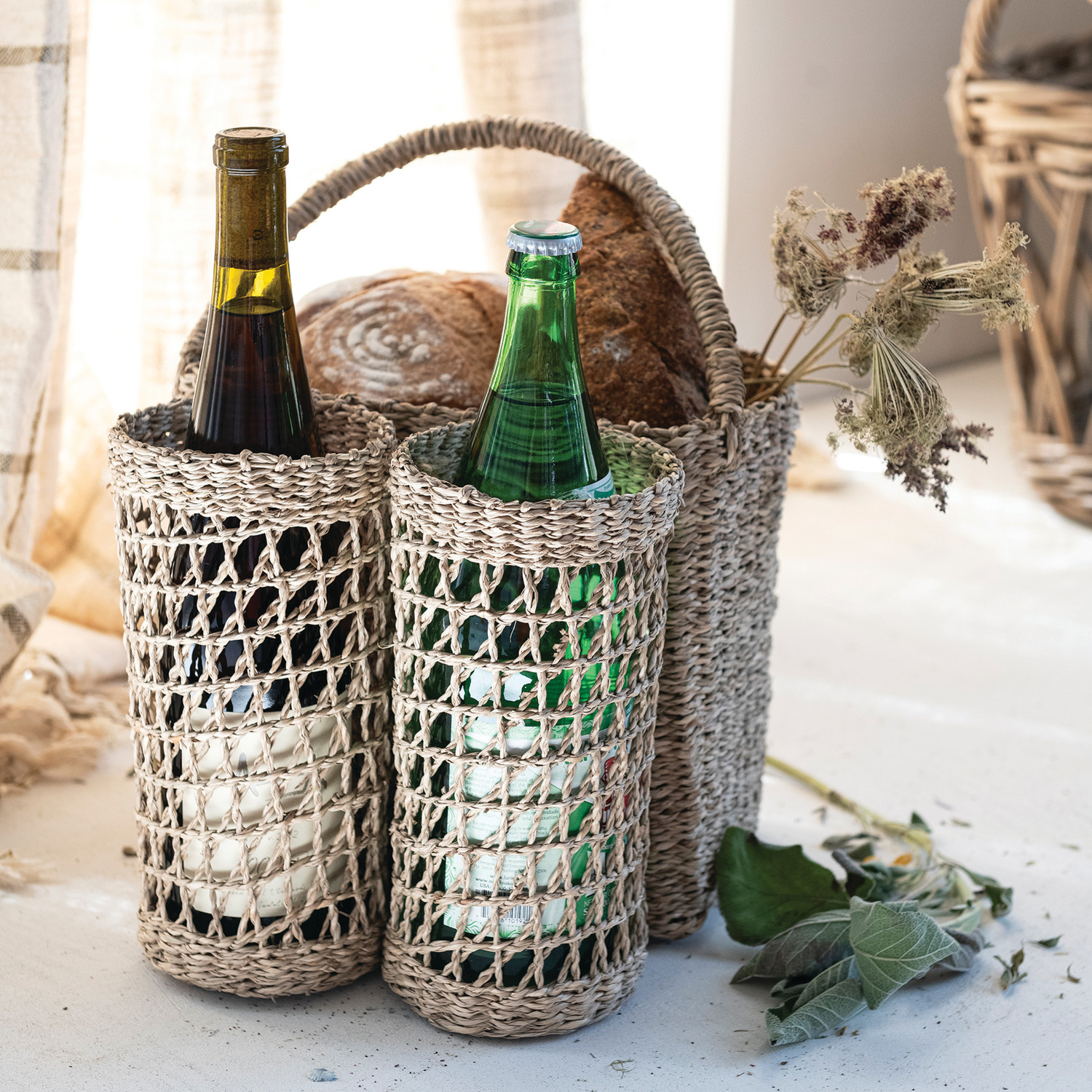 Hand-Woven Seagrass Basket with Handle & Bottle Holders, Natural (Holds 2 Bottles)