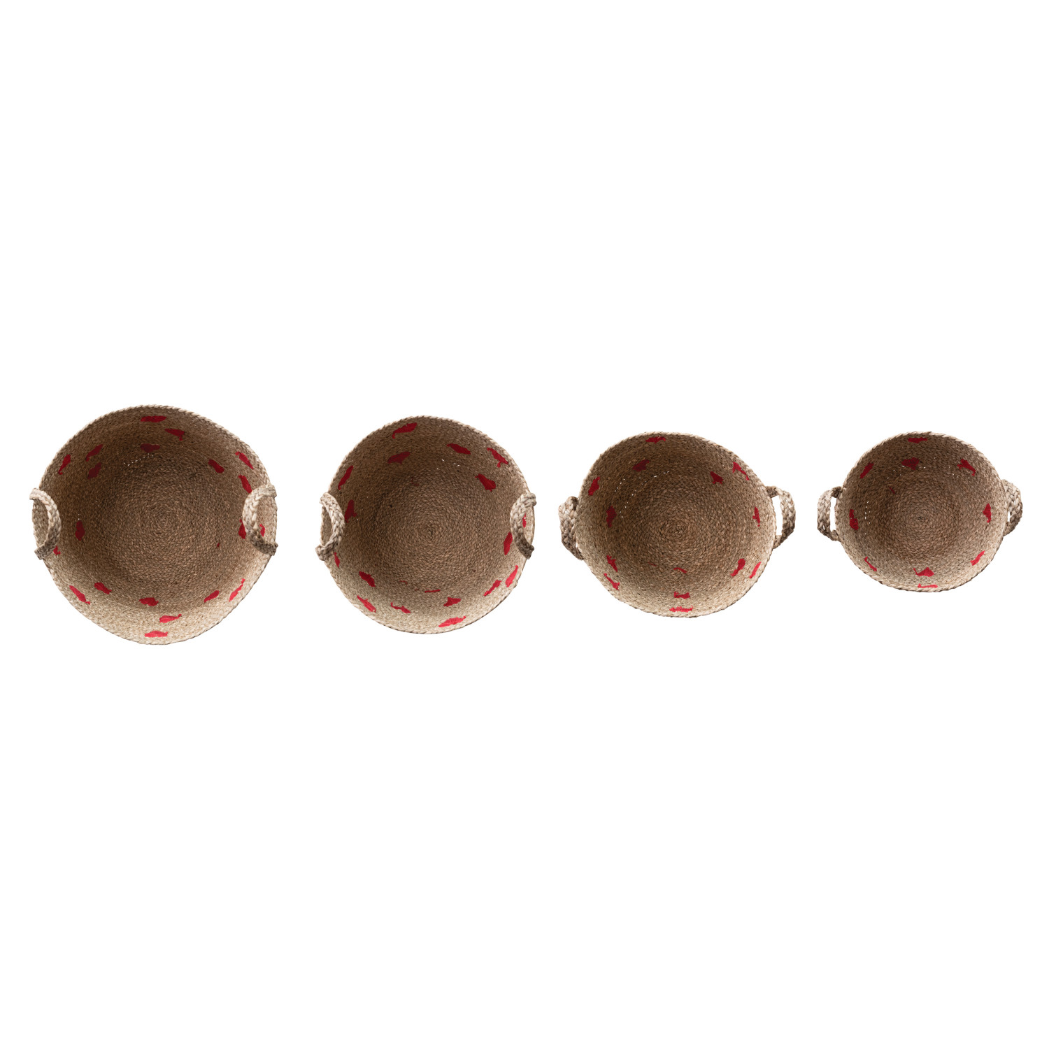 Hand-Woven Seagrass Baskets with Embroidered Hearts & Handles, Natural & Red, Set of 4