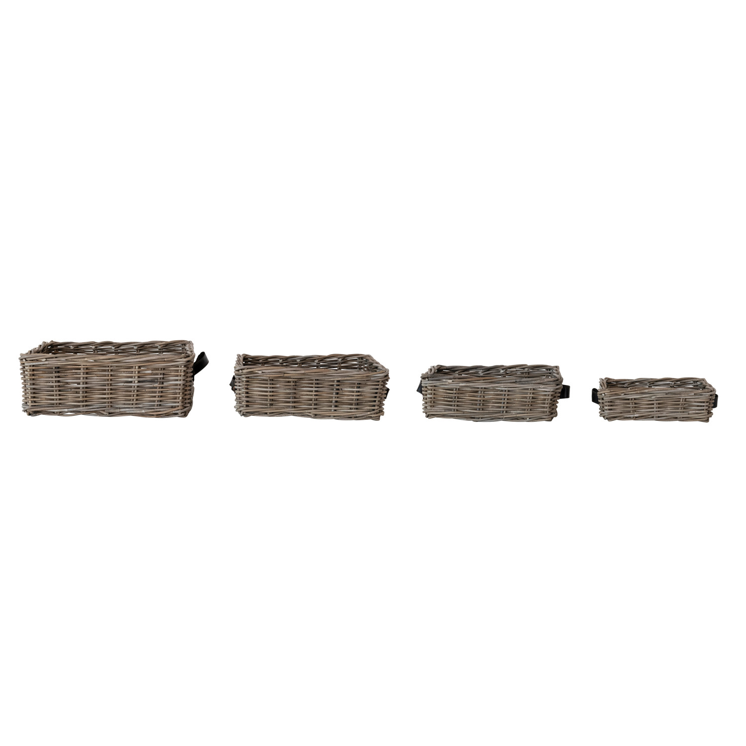 Catalog Name: 20"L x 15-3/4"W x 7"H, 17"L x 12-1/2"W x 6"H, 14"L x 10-1/4"W x 4-3/4"H & 11-1/2"L x 8-1/4"W x 3-1/2"H Hand-Woven Rattan Nesting Baskets w/ Leather Handles, Grey Washed, Set of 4