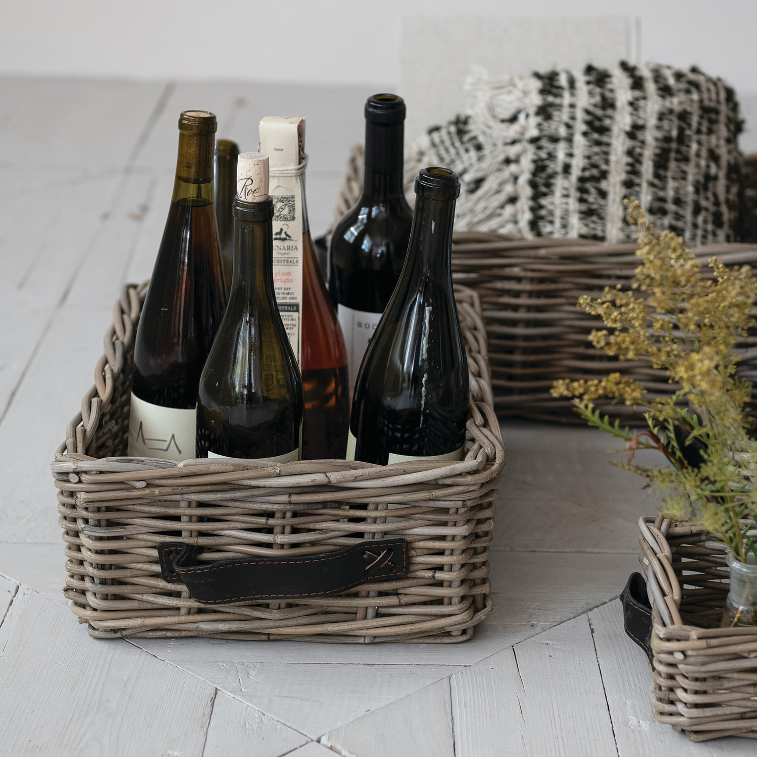 Hand-Woven Rattan Nesting Baskets with Leather Handles, Grey Washed, Set of 4