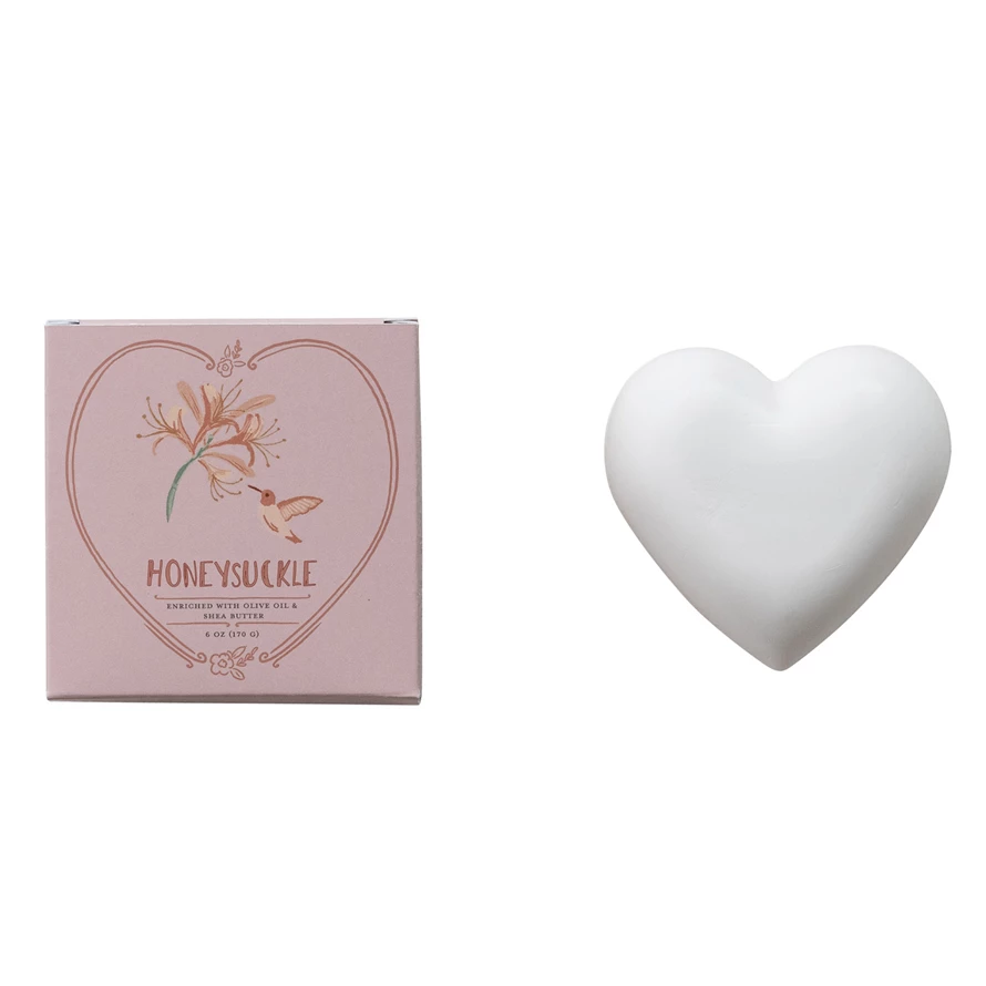 Catalog Name: Honeysuckle Scented Olive Oil & Shea Butter Triple Milled Heart Shaped Bar Soap, Made In The U.S.A.