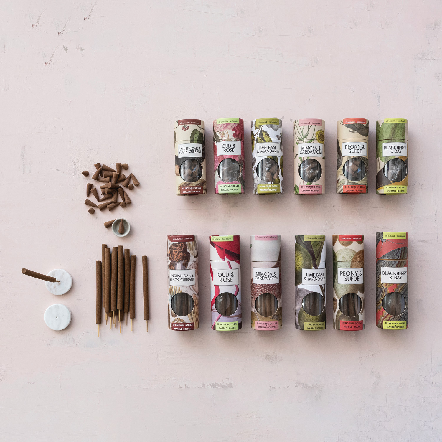 Catalog Name: 1"L 30 Piece All Natural Handmade Peony & Suede Scented Incense Cones in Printed Tube w/ 1-1/2" Round Ceramic Incense Holder, Set of 31 (Est. Burn Time 20 Minutes)