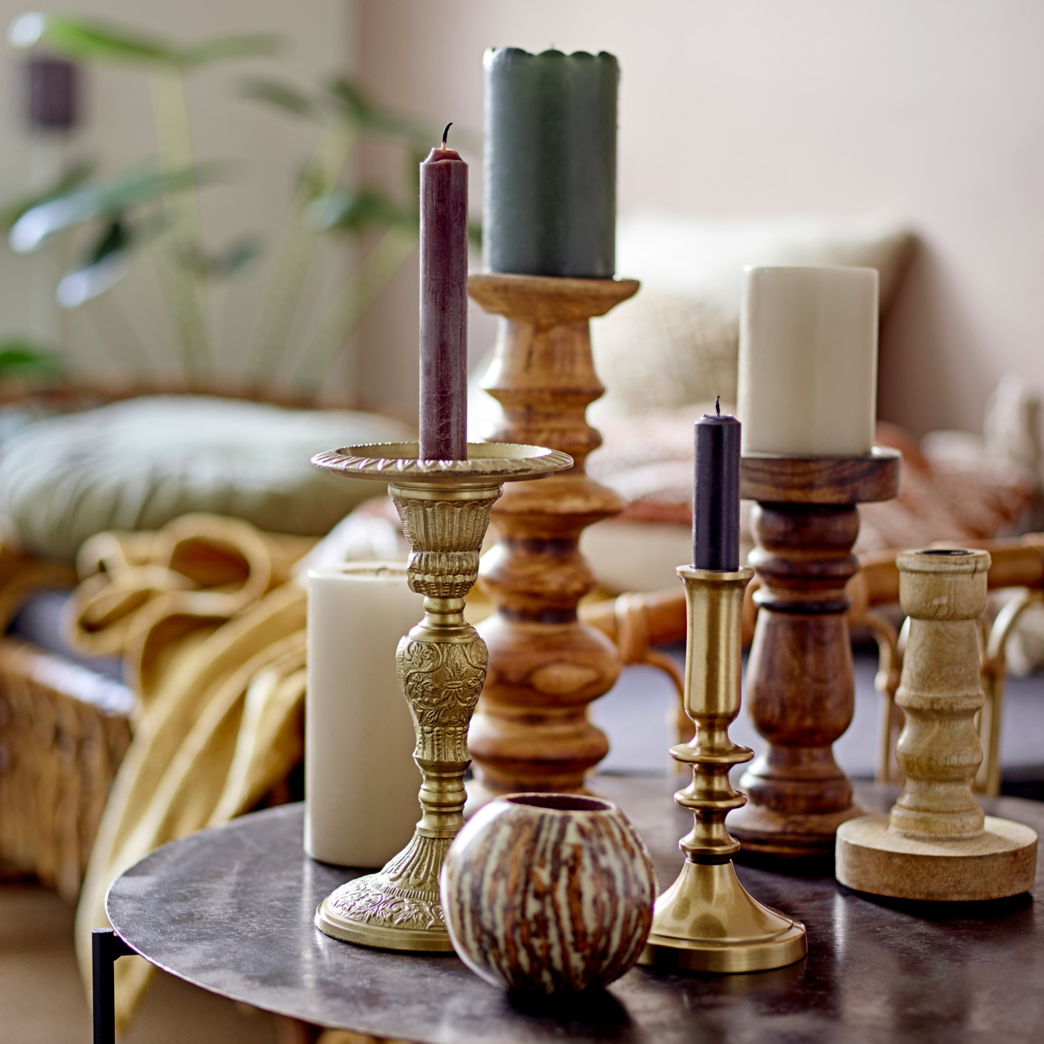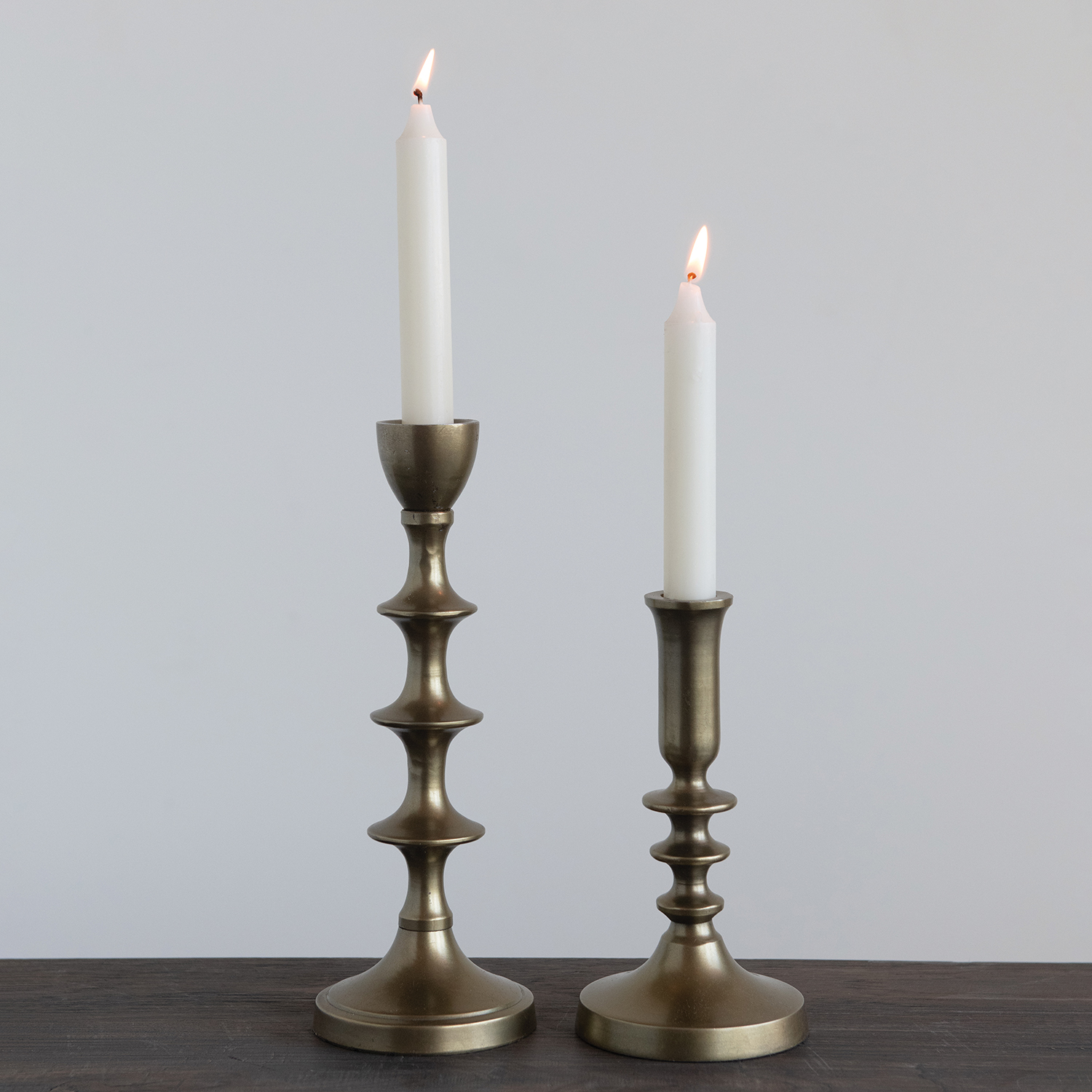 This set of aluminum candle holders is a stunning antique gold color. The patina has a worn and vintage look, as if you picked up this unique candle holder set at a local antique store. Both candle holders have fluted shapes with rounded details. The candle holders hold standard taper candles.
