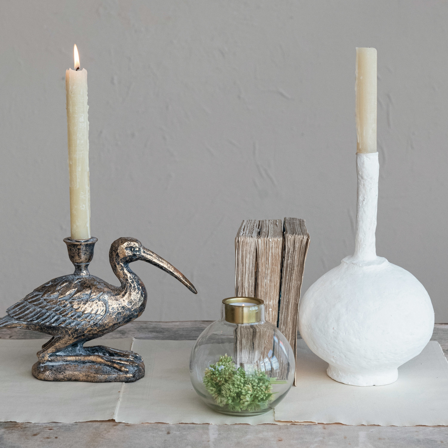 This reclaimed fillable glass and brass taper holder is a stunning and practical piece for any home. It consists of a round glass base and a brass top that can hold a taper candle. The glass base is reclaimed from old bottles, jars, or windows, which means it has a unique and vintage look. The brass top adds a touch of warmth and sophistication to this taper holder. It is perfect for holding and displaying taper candles, or for filling with water, sand, shells, or other decorative items to create a personalized and creative effect. It can also be used as a vase or a centerpiece for fresh or dried flowers. This taper holder is made of glass and metal, a durable and elegant material combination that adds charm and character. It is easy to clean and maintain, and it will last for a long time. It measures Measures 5 inches in diameter and 5.25 inches in height, making it suitable for any space. This reclaimed fillable glass and brass taper holder is a must-have for anyone who loves style and versatility.