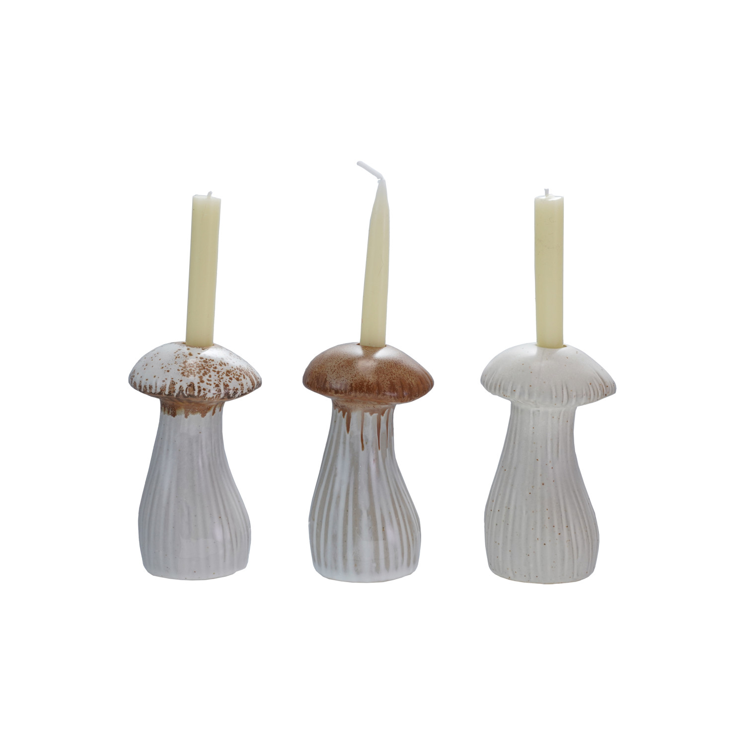 Catalog Name: 2" Round x 3-3/4"H Stoneware Mushroom Shaped Taper Holder, Reactive Glaze, 3 Colors (Holds 1/2" Taper) (Each One Will Vary)