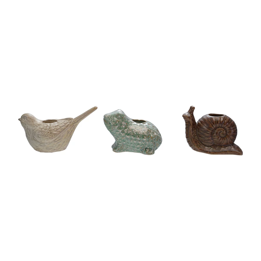 Catalog Name: 5-1/8"L Stoneware Bird/Snail/Frog Shaped Taper Holder, Reactive Glaze, Multi Color, 3 Styles (Each One Will Vary)