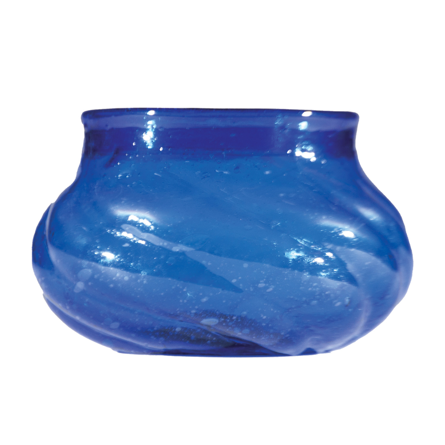 Catalog Name: 5" Round x 3-1/4"H Hand-Blown Seeded Twisted Glass Tealight/Votive Holder, Blue