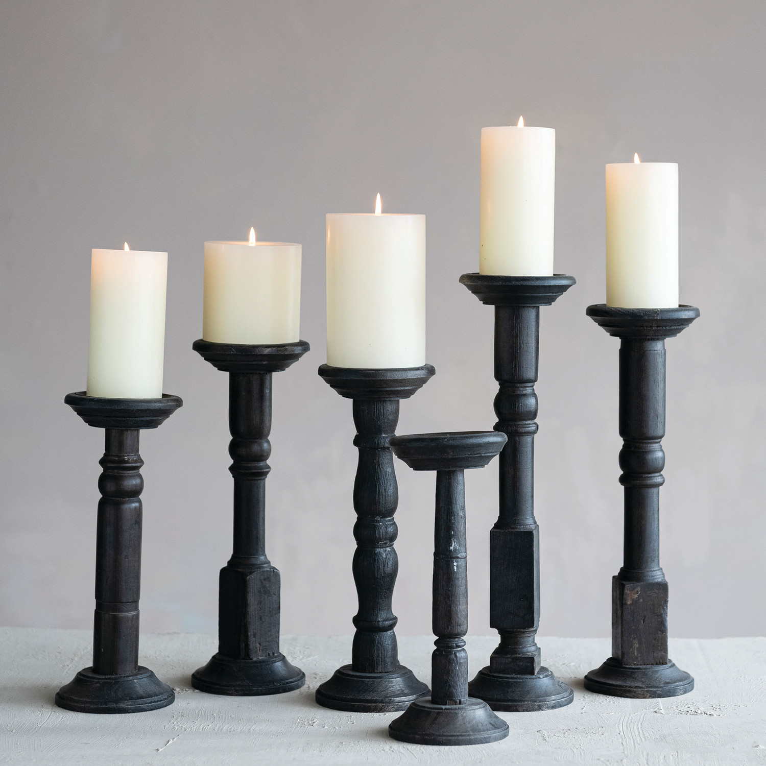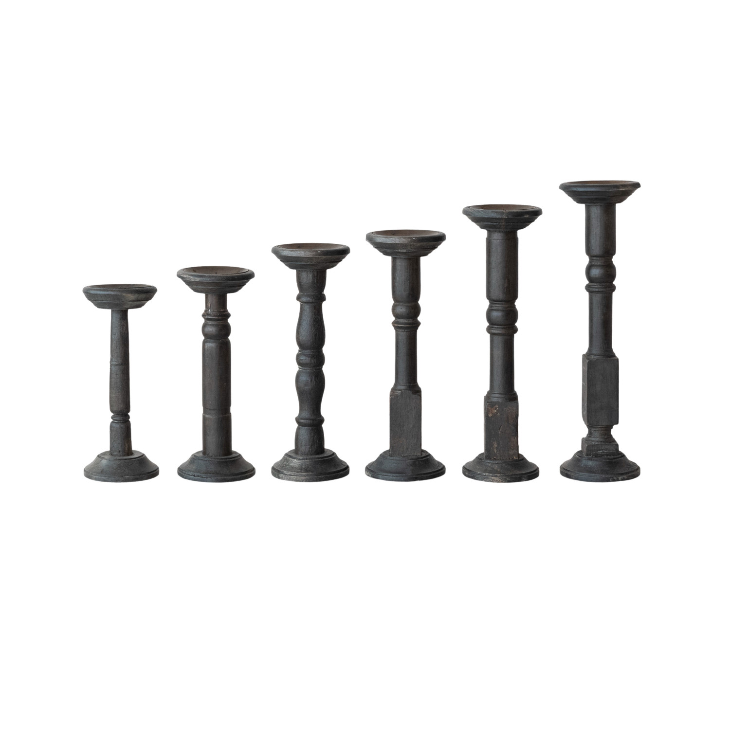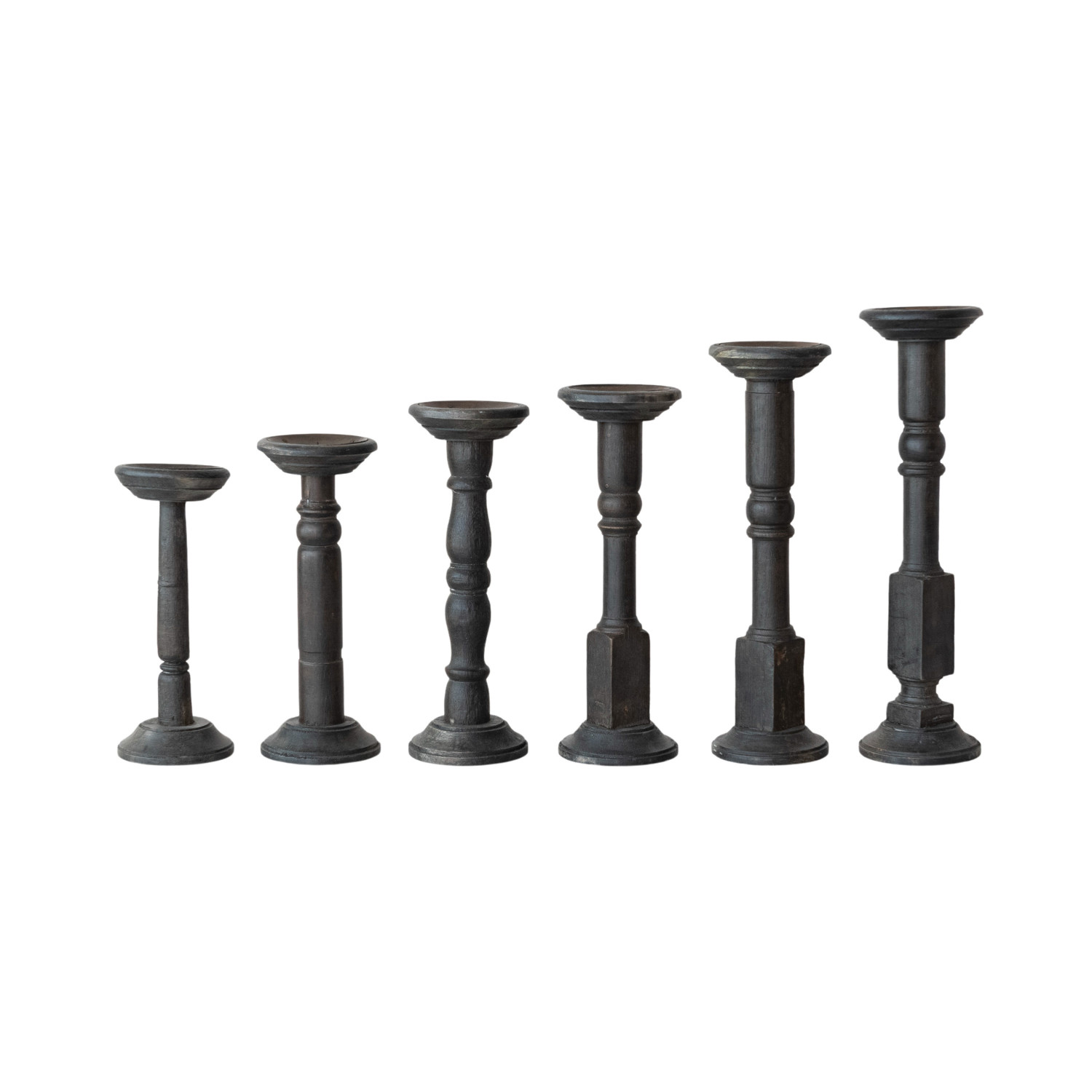 Catalog Name: Approximately 17-1/2"H, 16"H, 15-1/2"H, 13-1/2"H, 12-1/2"H & 11-1/2"H Found Turned Wood Candle Holders, Black, Set of 6 (Holds 3" Pillar) (Each One Will Vary)