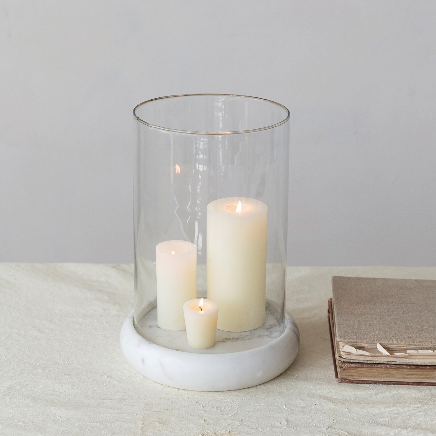 9" Round x 12-1/2"H Glass Hurricane with Marble Base, White, Set of 2