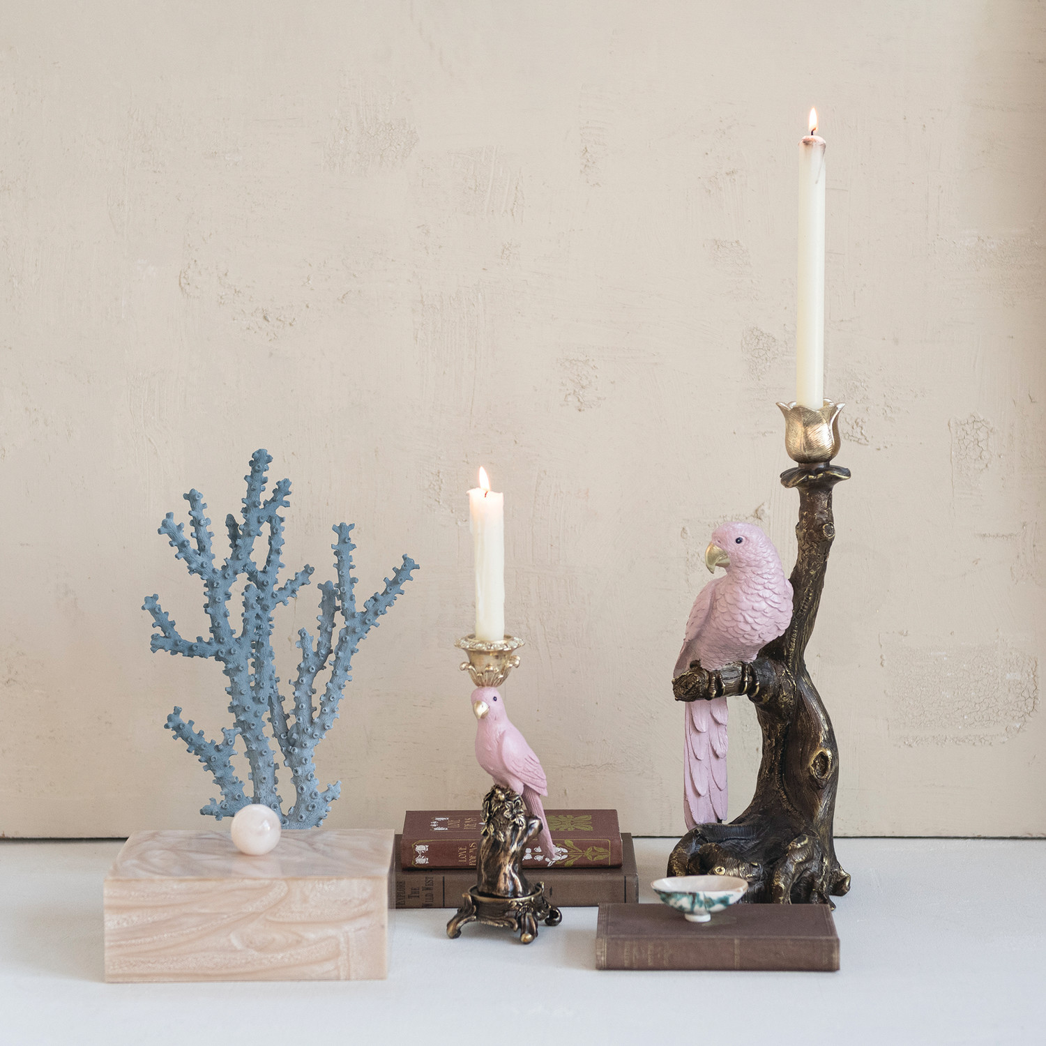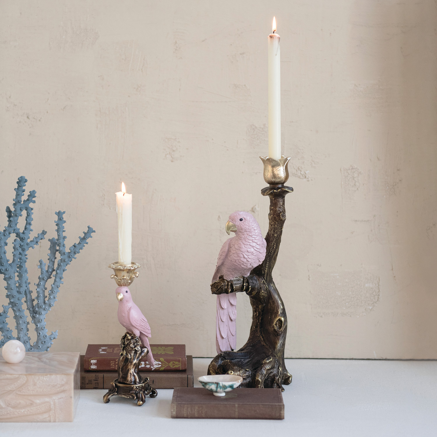 Resin Taper Holder with Parrot on Branch, Antique Gold Finish & Pink