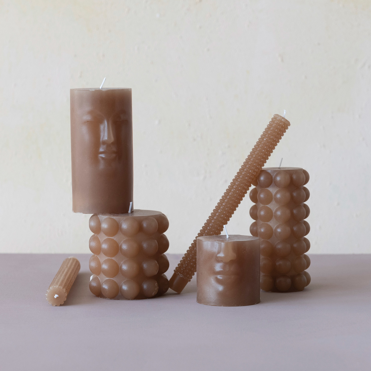 This intricately carved pillar candle showcases the striking silhouette of a face. Mix and match the hues and sculptural silhouettes of our artfully crafted totems and tapers for a refined candlelight arrangement on a dining table or mantelpiece.