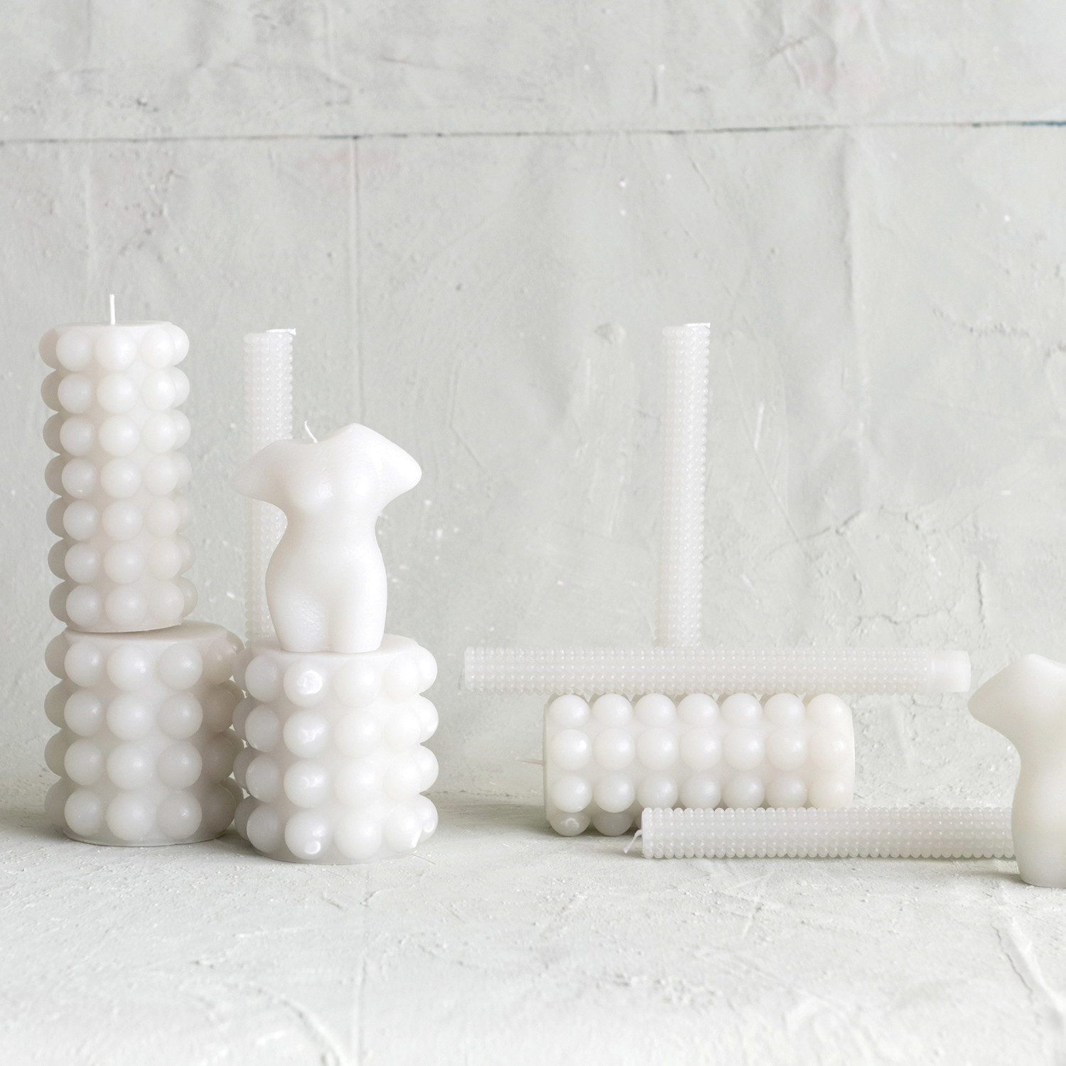 This intricately carved pillar candle showcases a striking hobnail design. Mix and match the hues and sculptural silhouettes of our artfully crafted totems and tapers for a refined candlelight arrangement on a dining table or mantelpiece.