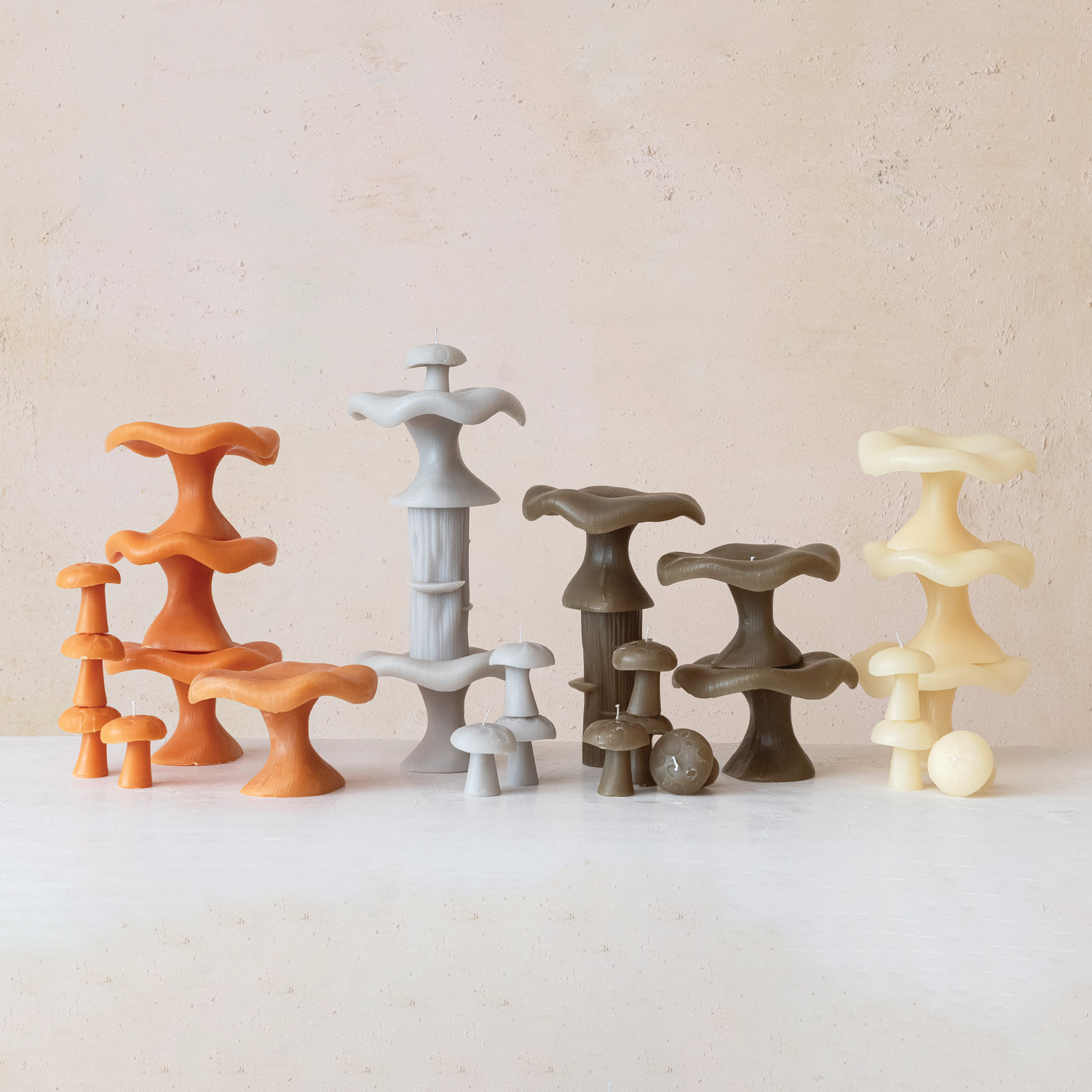 This unscented mushroom-shaped candle is a beautiful way to add whimsy and charm to the home. The candle is made of paraffin wax that is safe and long-lasting. The candle has a round shape and a mushroom-like cap in various colors, such as cream, olive, grey, and orange, and complements any garden, cottagecore, farmhouse, cabin, or woodland-style home. The candle measures 6.75 inches in length, 6.75 inches in width, and 4.5 inches in height and has an approximate burn time of 8 hours. Use this candle for decorating or creating a cozy atmosphere in the home. This unscented mushroom-shaped candle is a versatile and beautiful piece to enhance the space. Create an inviting atmosphere with these candle collections.