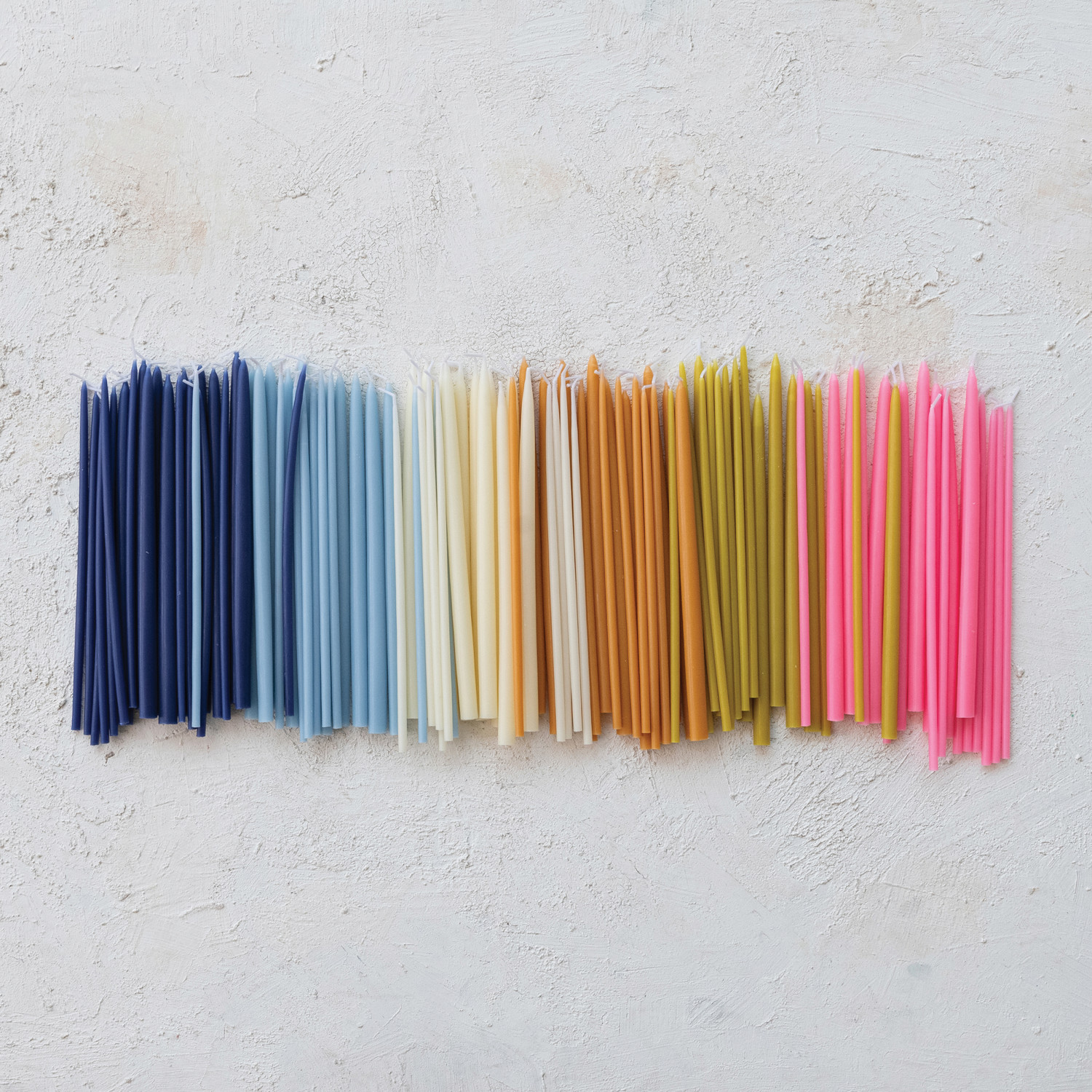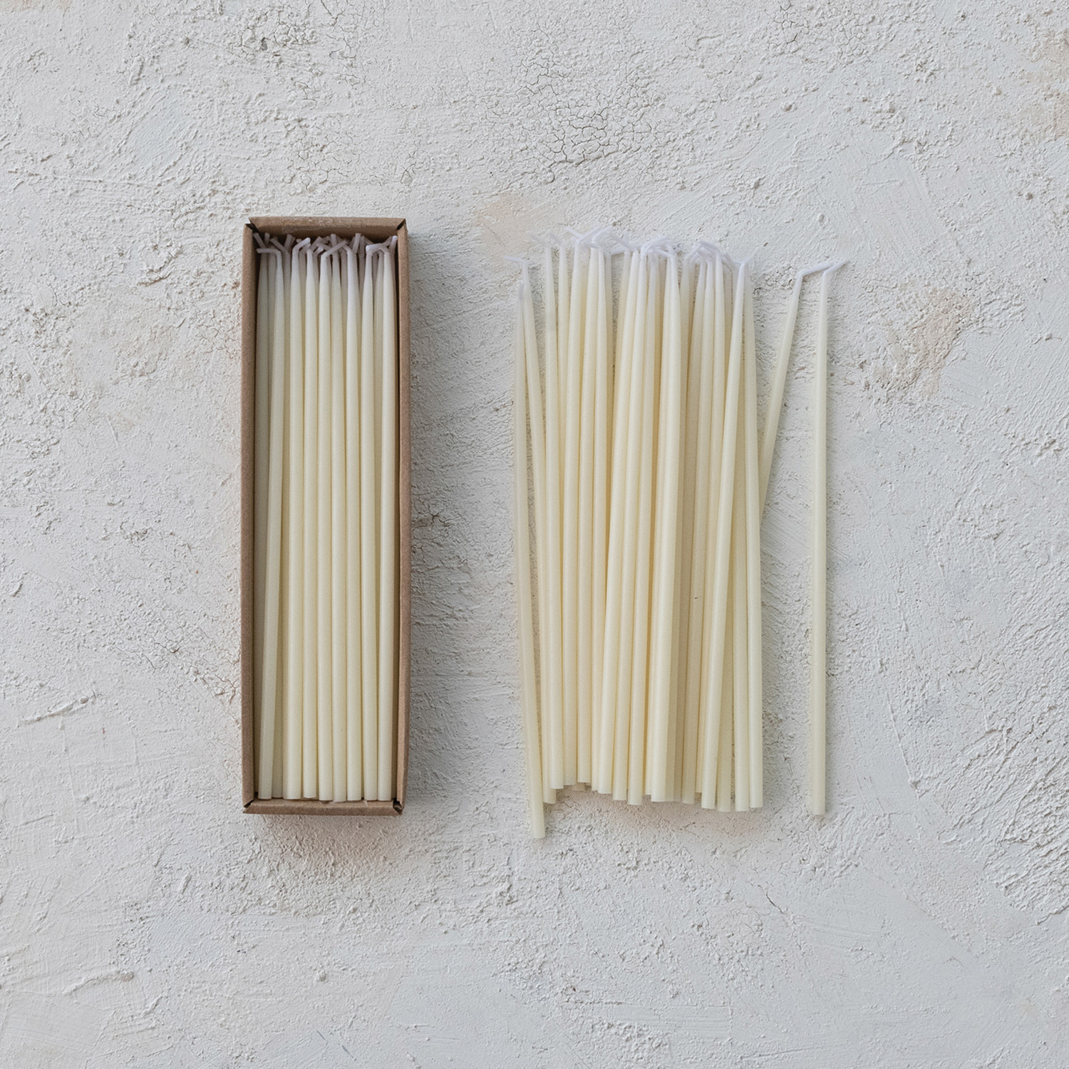 Catalog Name: Approx. 1/4" Round x 10"H Unscented Thin Taper Candles in Box, Ivory Color, Set of 36 (Est. Burn Time 1-1/2 Hours)