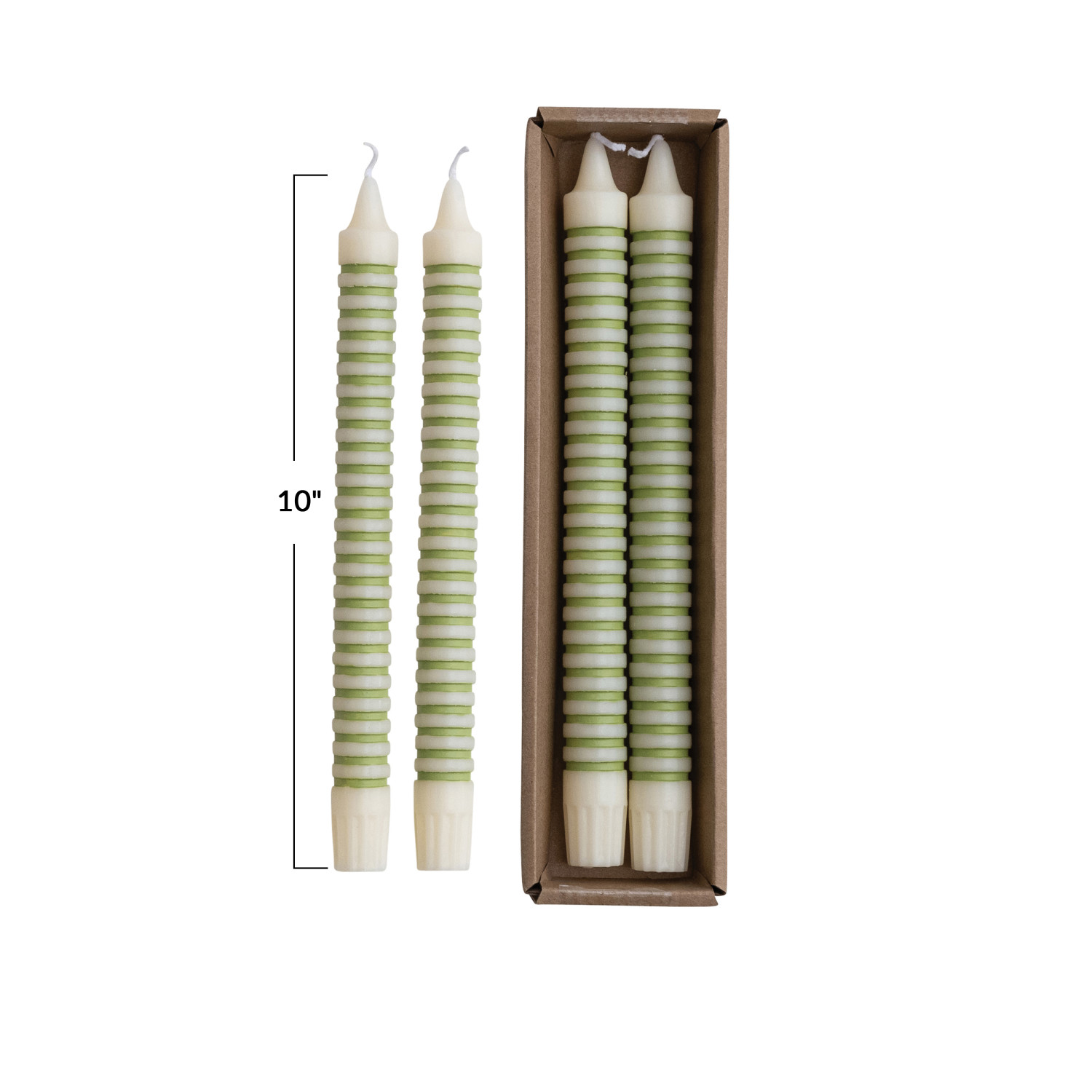 Catalog Name: 10"H Unscented Striped Taper Candles in Box, Green, Set of 2 (Est. Burn Time 6 Hours)