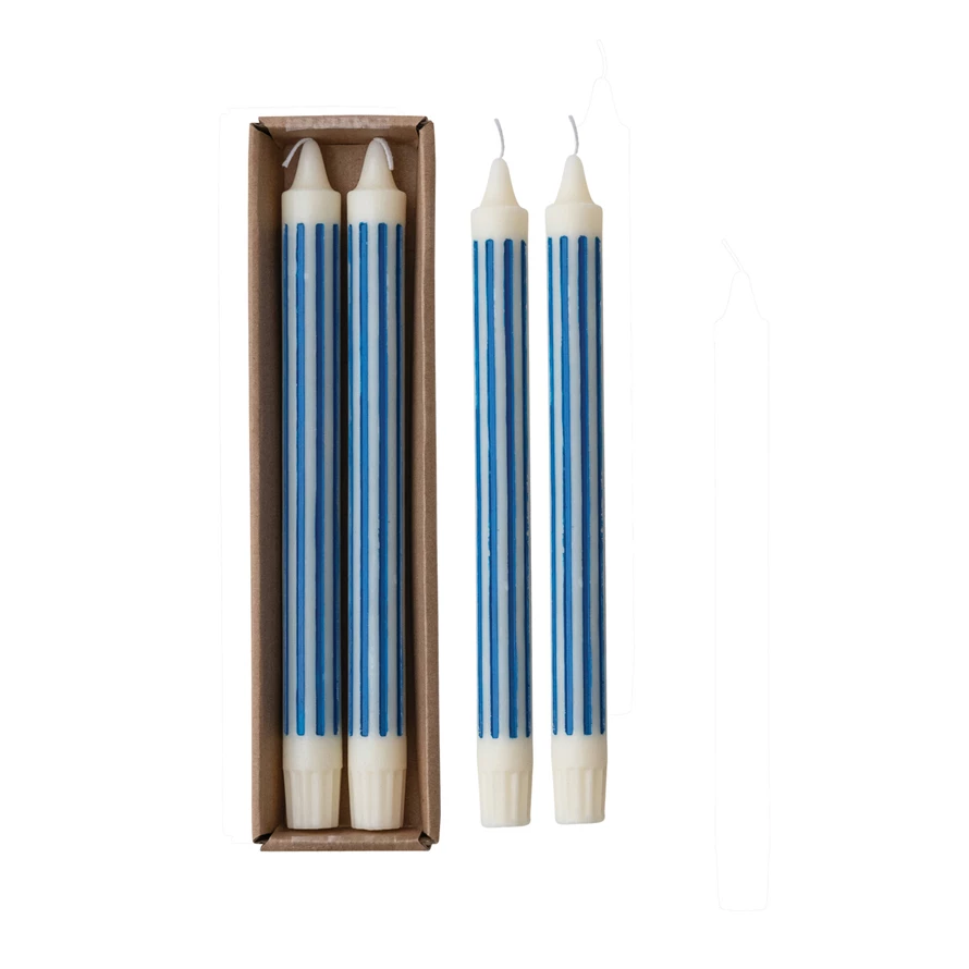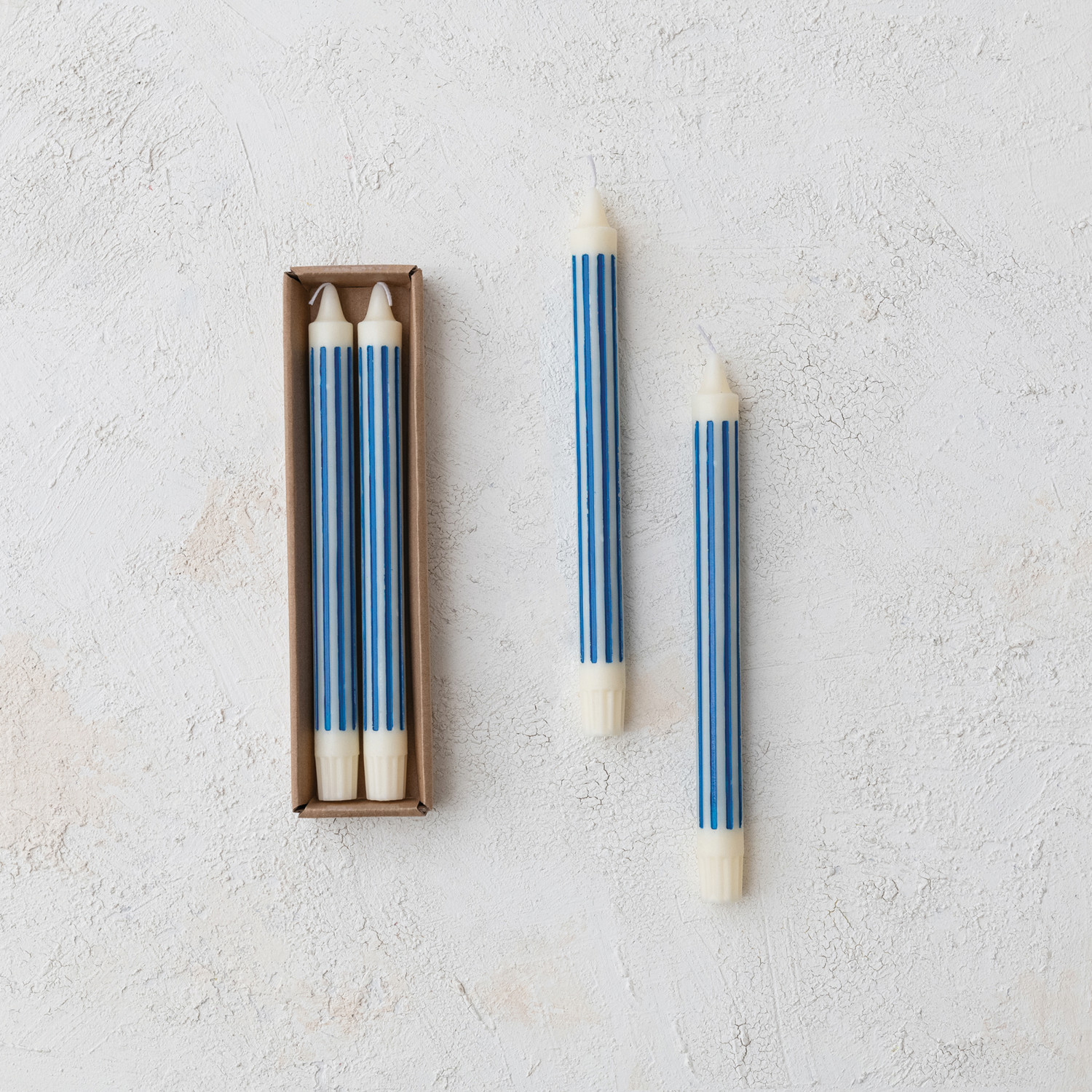 Catalog Name: 10"H Unscented Striped Taper Candles in Box, Blue, Set of 2 (Est. Burn Time 6 Hours)