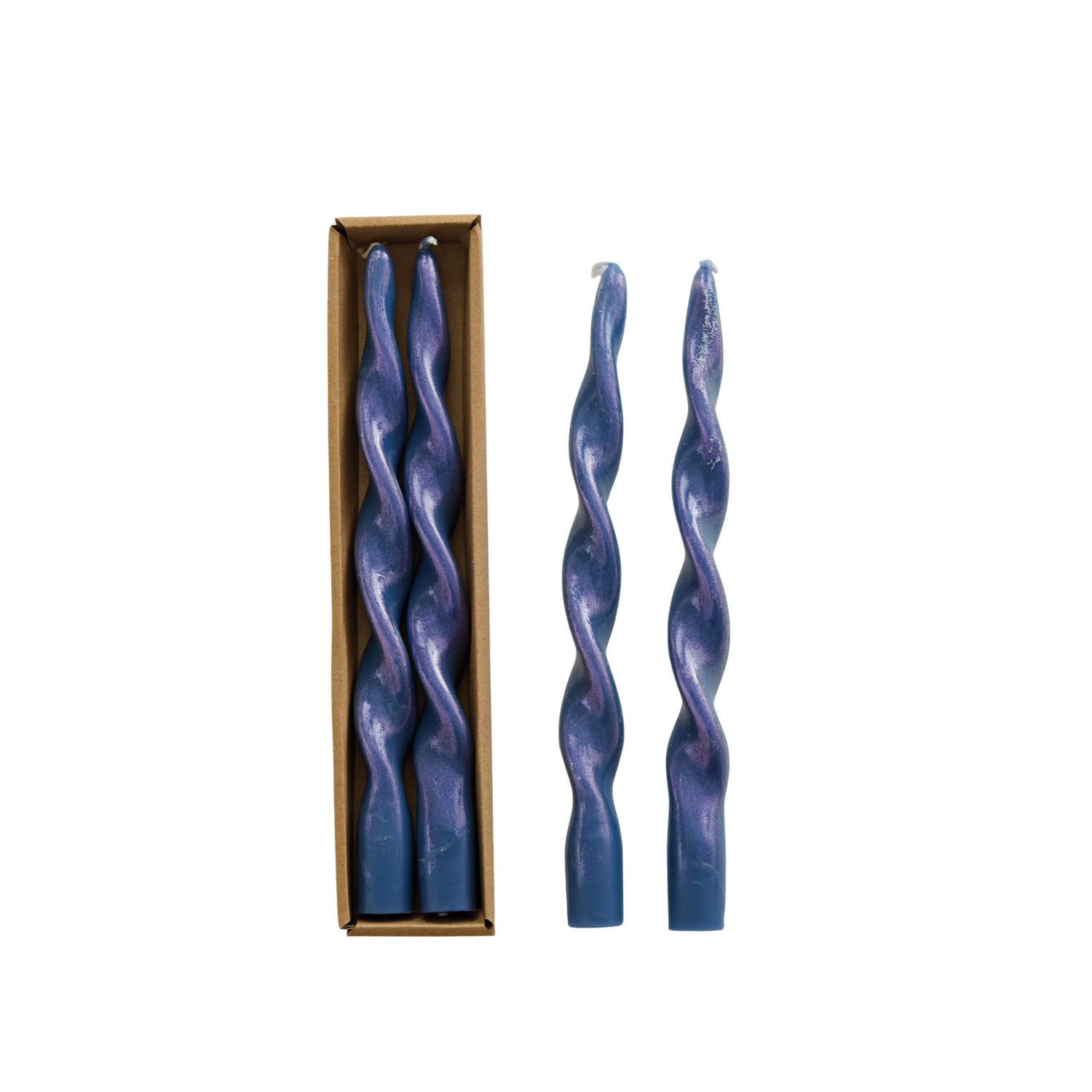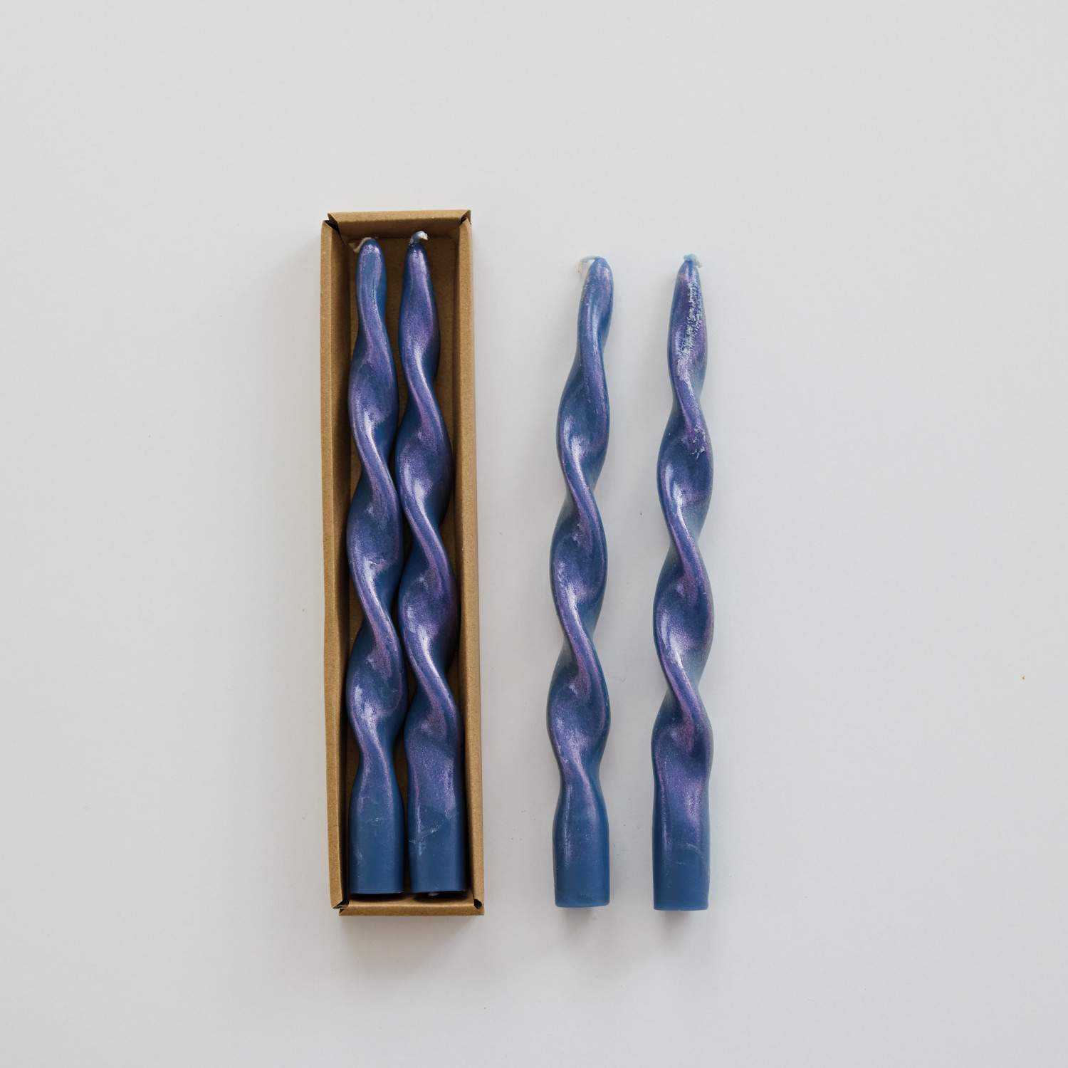 Unscented Twisted Taper Candles in Box, Iridescent Rainbow Finish, Blue, Set of 2