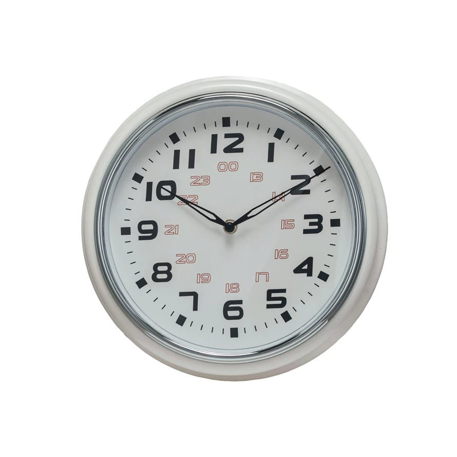 This 12-inch Round Metal Wall Clock combines functionality with style. The chrome finish provides a modern touch, while the cream color offers a warm, inviting look. It's an ideal addition to any room, enhancing the space with its simple yet sophisticated design. The clock's round shape and metal construction make it a durable choice for those who appreciate a blend of contemporary and classic elements in their timekeeping devices. The large numbers and clear clock hands make it easy to read from a distance, perfect for keeping track of time throughout the day. Hang it in the kitchen, living room, or office for a sleek and practical decor piece.