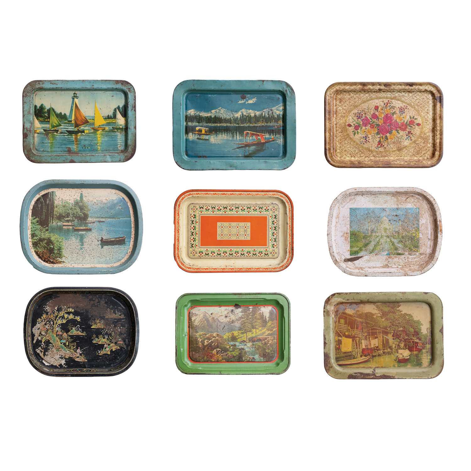 Catalog Name: Approximately 17"L x 12"W Found Decorative Metal Tray w/ Image, Heavily Distressed Finish, Multi Color (Each One Will Vary)