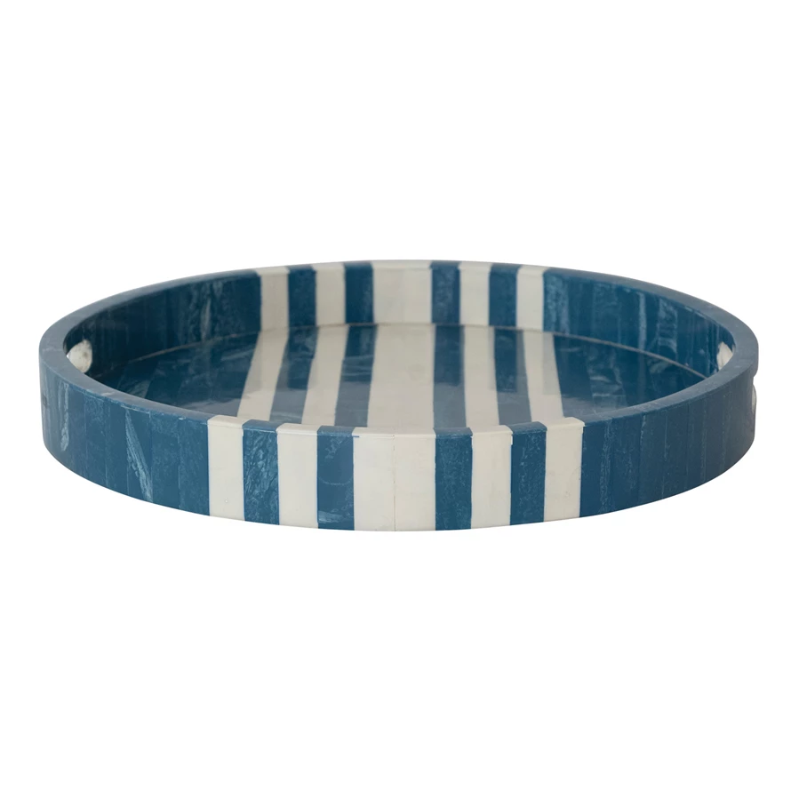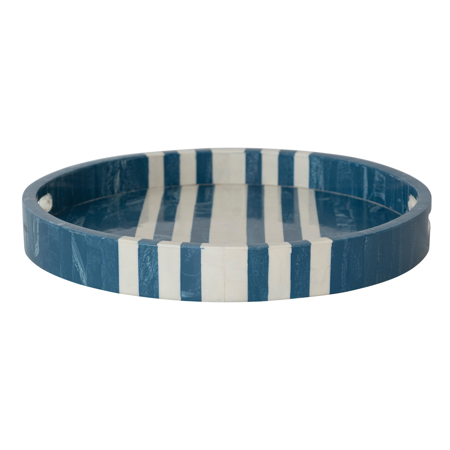 Catalog Name: 16" Round Decorative Inlaid Marbled Resin & MDF Tray w/ Stripes & Handles, Blue & White (Each One Will Vary)