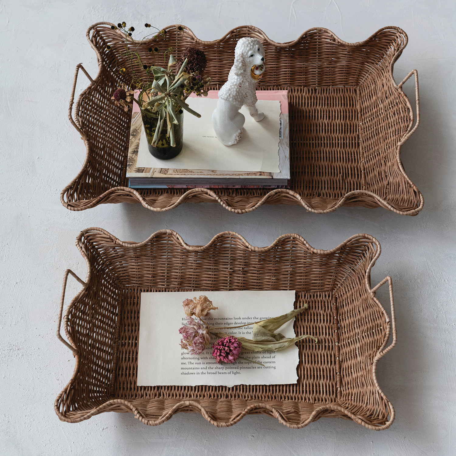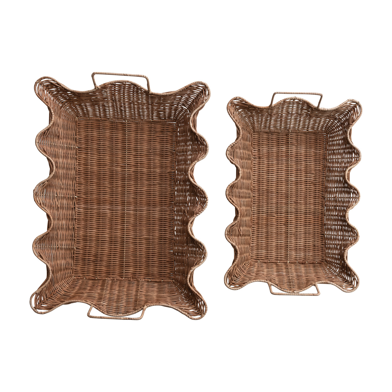 Decorative Hand-Woven Rattan Scalloped Nesting Trays with Handles, Natural, Set of 2