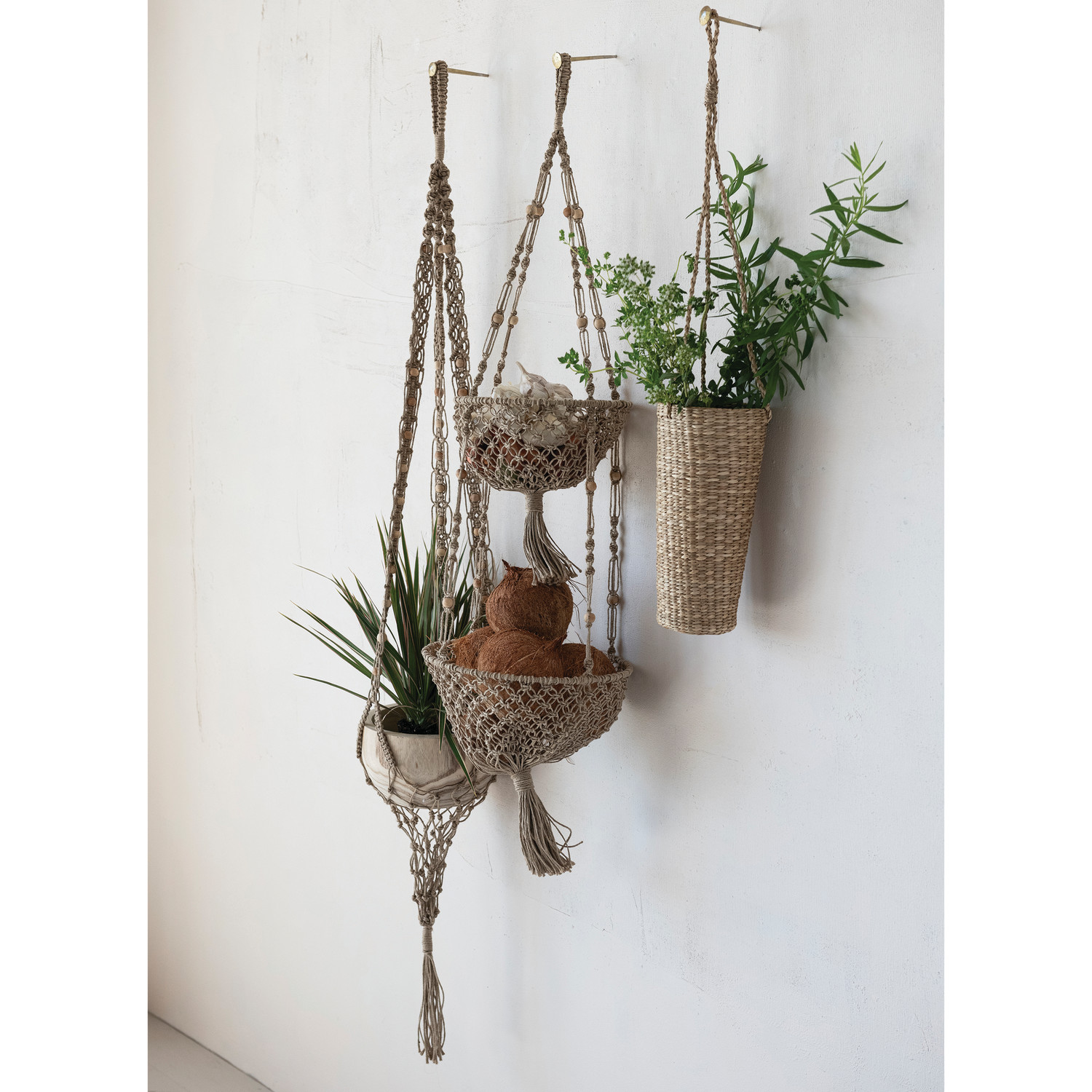Jute Macrame Plant Hanger with Wood Beads & Tassel, Natural