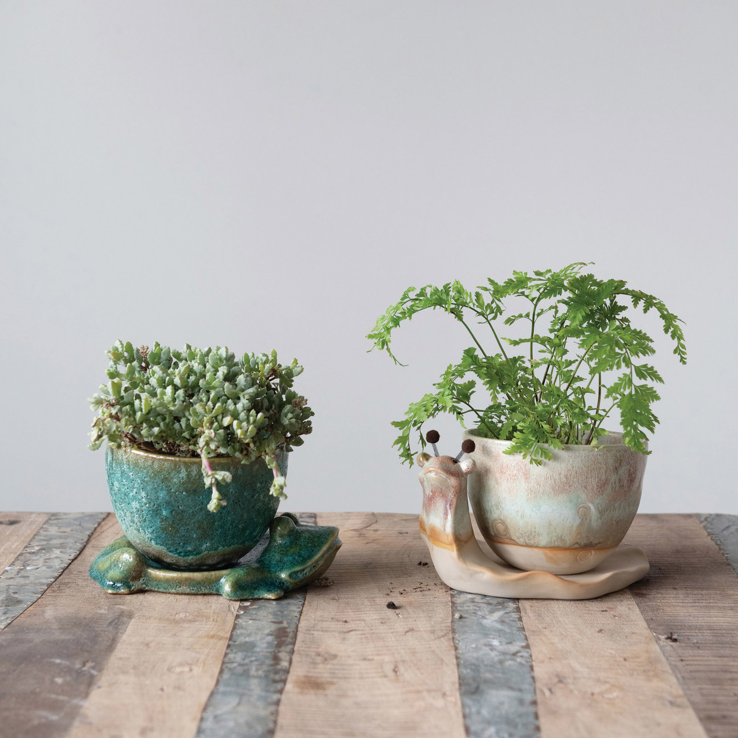This whimsical stoneware planter with snail base has an earthy neutral reactive glaze finish and comes as a set of two. The pot has a drainage hole and is sized to hold a 4-inch pot of succulents, herbs, or flowers. The snail body acts as a saucer that catches the excess water and protects surface tops from water stains. The planter has a reactive glaze finish that gives it a natural l look. Beautifully detailed stonework and a unique design make this container an eye-catching piece in any home or business. Group the planter in a collection of complementary pieces or place it as a stand-alone accent. It can be placed in any garden, patio, or indoor space, and create a cute and cheerful sight. This stoneware snail planter with saucer is a versatile and attractive piece that can fit any style of home. Each will vary slightly.