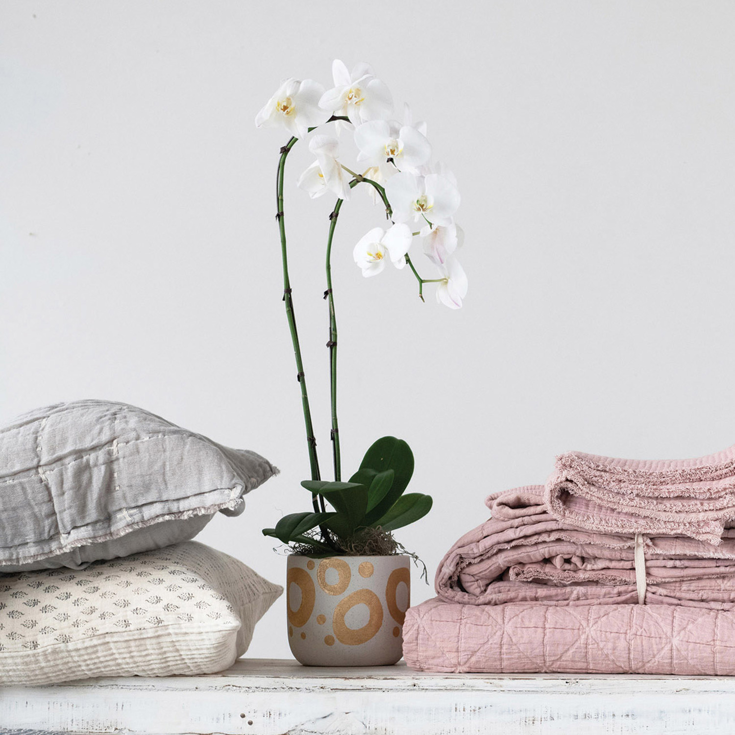 Elevate the home decor with this white stoneware planter with gold circles design, hand-painted by skilled artisans. This planter features a simple yet elegant design, with a white background and a gold circles pattern that adds a touch of sparkle and sophistication. The stoneware material is durable and sturdy, and the smooth and glossy finish enhances the beauty of the planter. The planter does not have a bottom hole, so place it on any surface without worrying about water damage. The planter measures 6.5 inches in diameter and 6 inches in height, and it can hold a 5-inch pot. It is perfect for displaying beautiful plants, flowers, or herbs, indoors or outdoors. This planter is a great way to add some minimalist, modern, or glam style to any home.