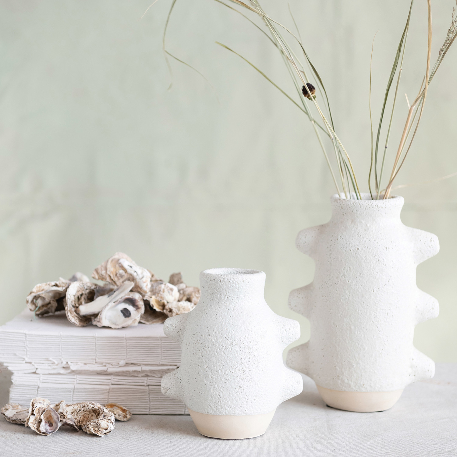 This contemporary stoneware vase showcases an abstract silhouette in a textured volcano finish.