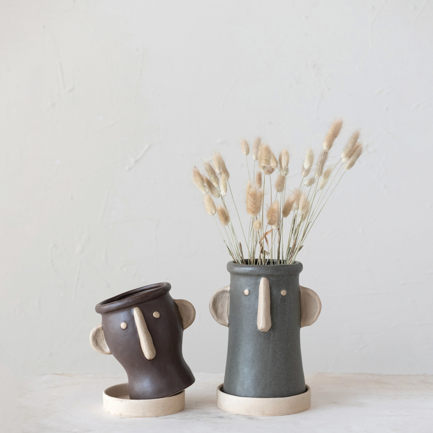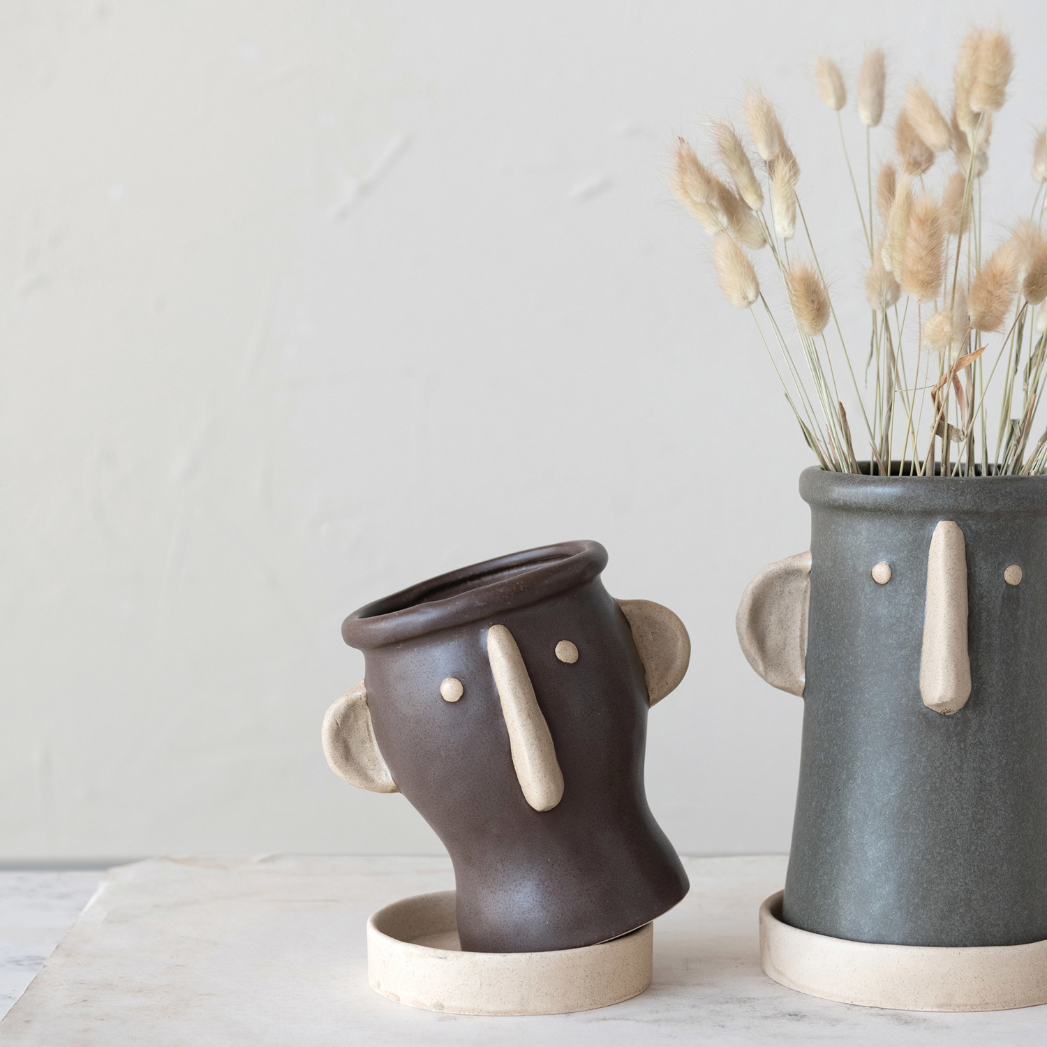 Catalog Name: 6" Round x 9-1/4"H Stoneware Face Planter w/ Saucer, Brown & Cream Color, Set of 2 (Holds 5" Pot)