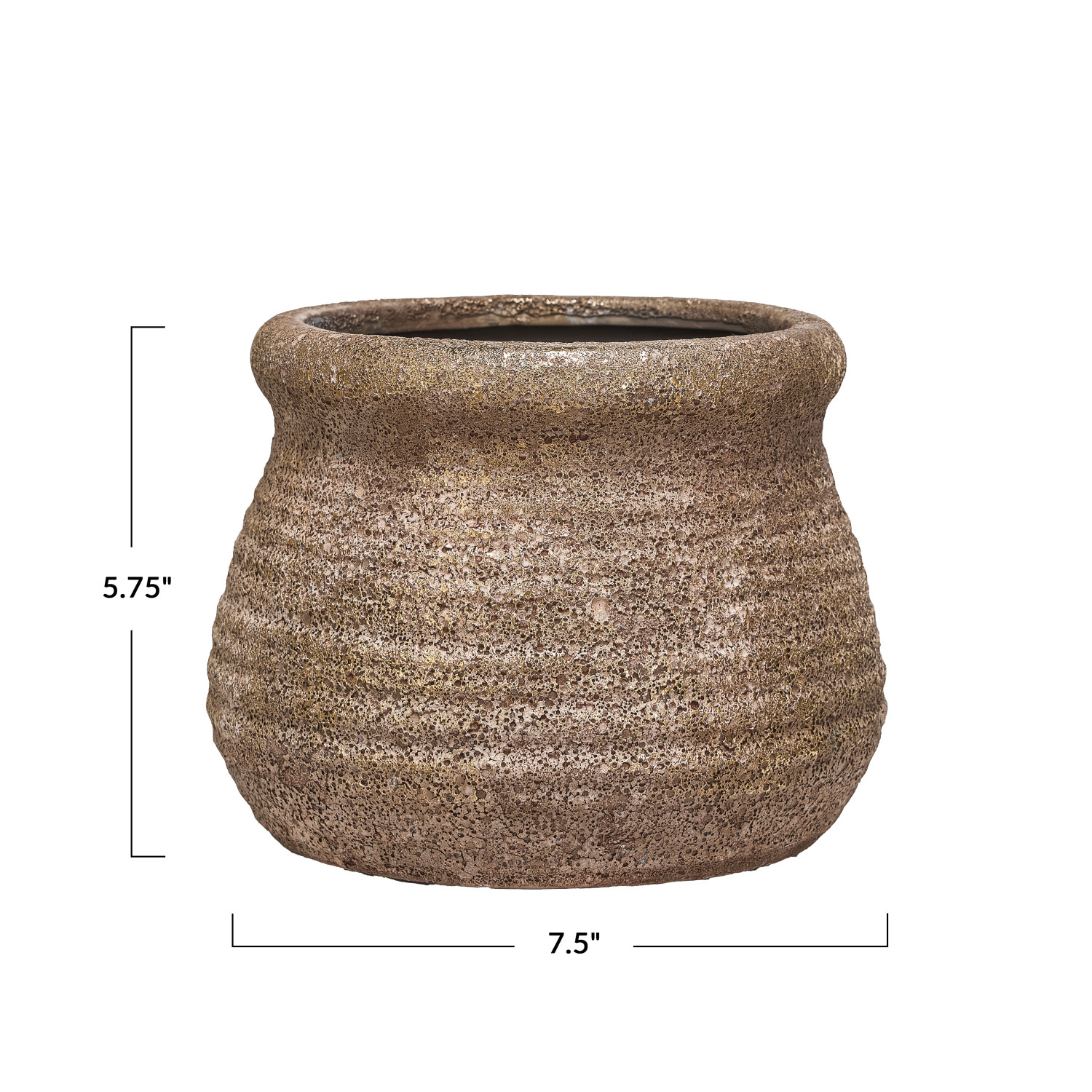 Catalog Name: 7-1/2" Round x 5-3/4"H Coarse Terra-cotta Planter, Volcano Finish, Gold Finish (Holds 6" Pot) (Each One Will Vary)