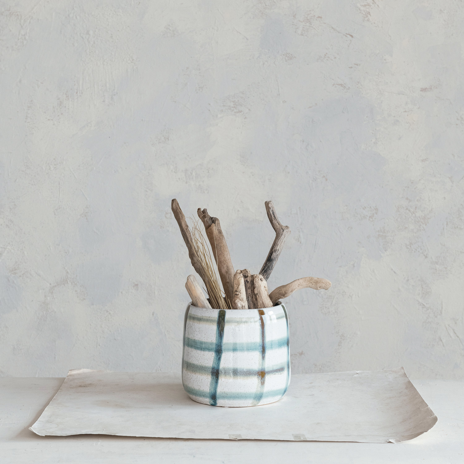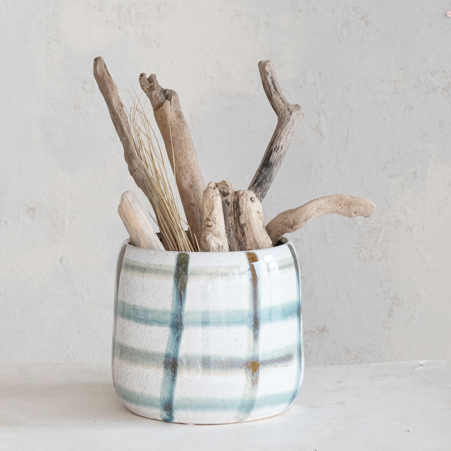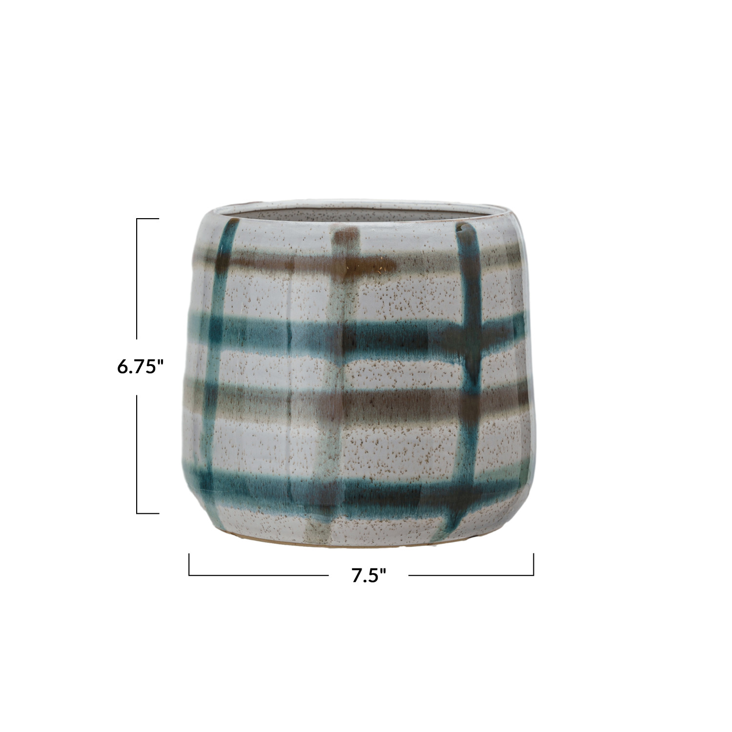 This Round Hand-Painted Stoneware Planter is a charming addition to any indoor garden. The multi-colored grid pattern is enhanced by the reactive glaze, creating a one-of-a-kind finish on each piece. Measures 7.5 inches in diameter and 6.75 inches in height, a size that's just right for tabletops or windowsills. It's designed to hold a 7-inch pot, making it versatile for a variety of plant types. Whether aiming for a farmhouse feel, a French country look, or a transitional style, this planter will fit right in, bringing a splash of color and a dash of personality to any space and elevating the overall aesthetic.