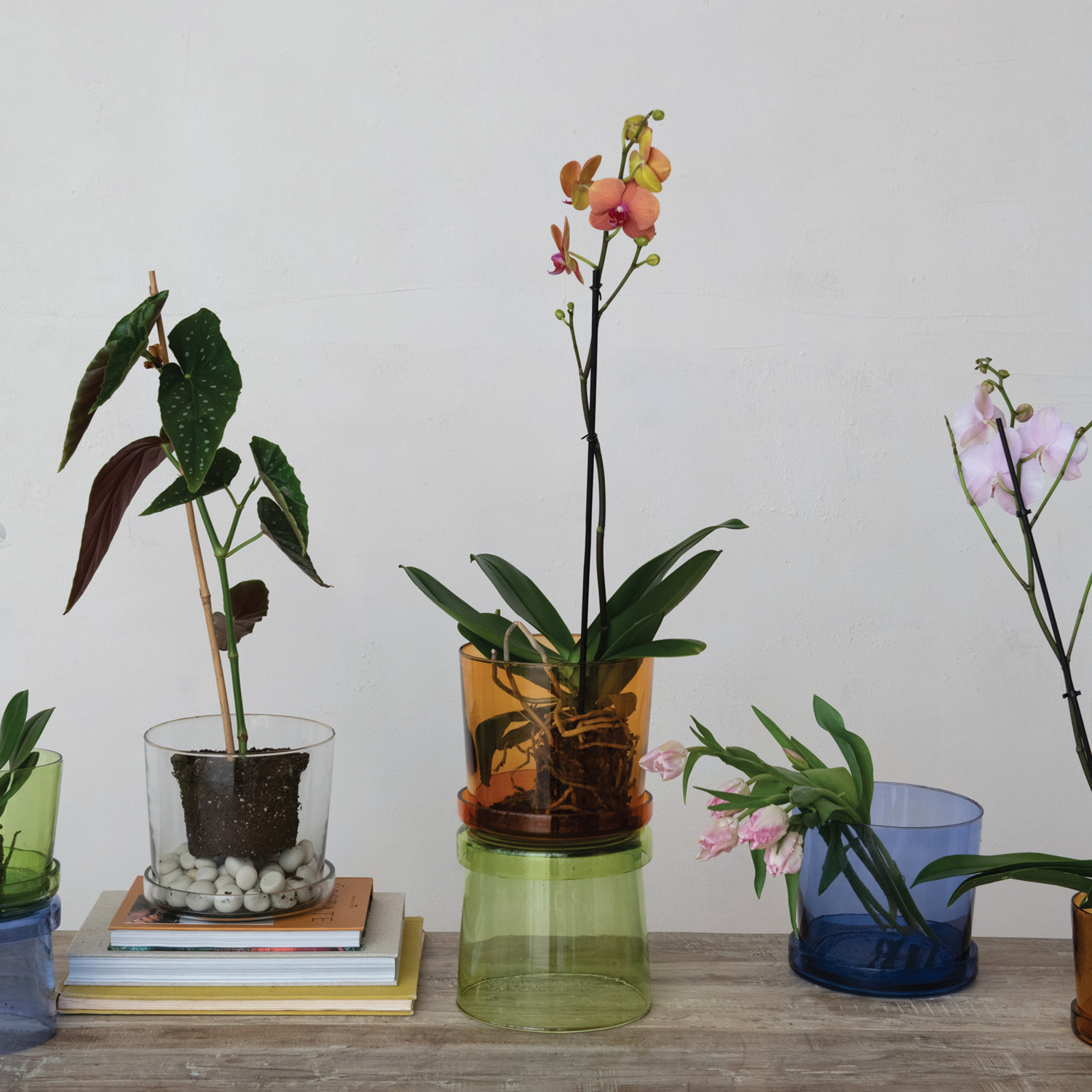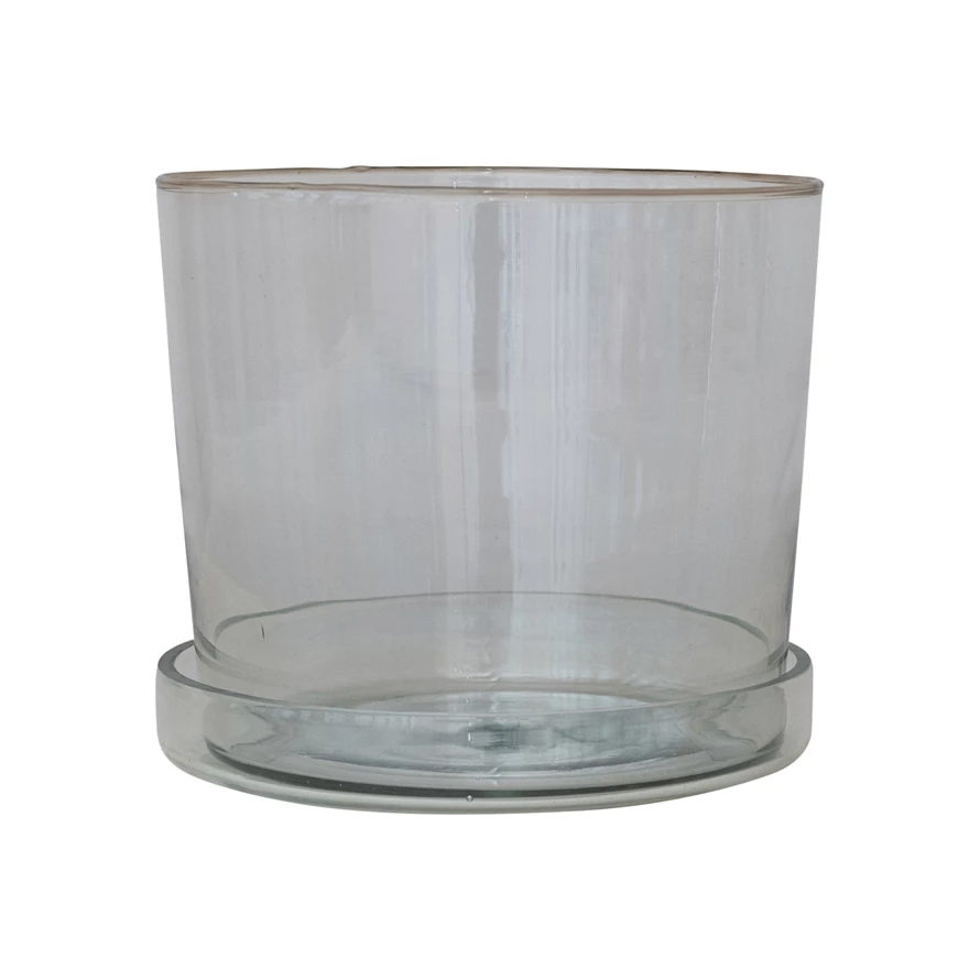 Hand-Blown Recycled Glass Planter w/ Drainage Hole & Saucer, Set of 2 (Holds 7" Pot)