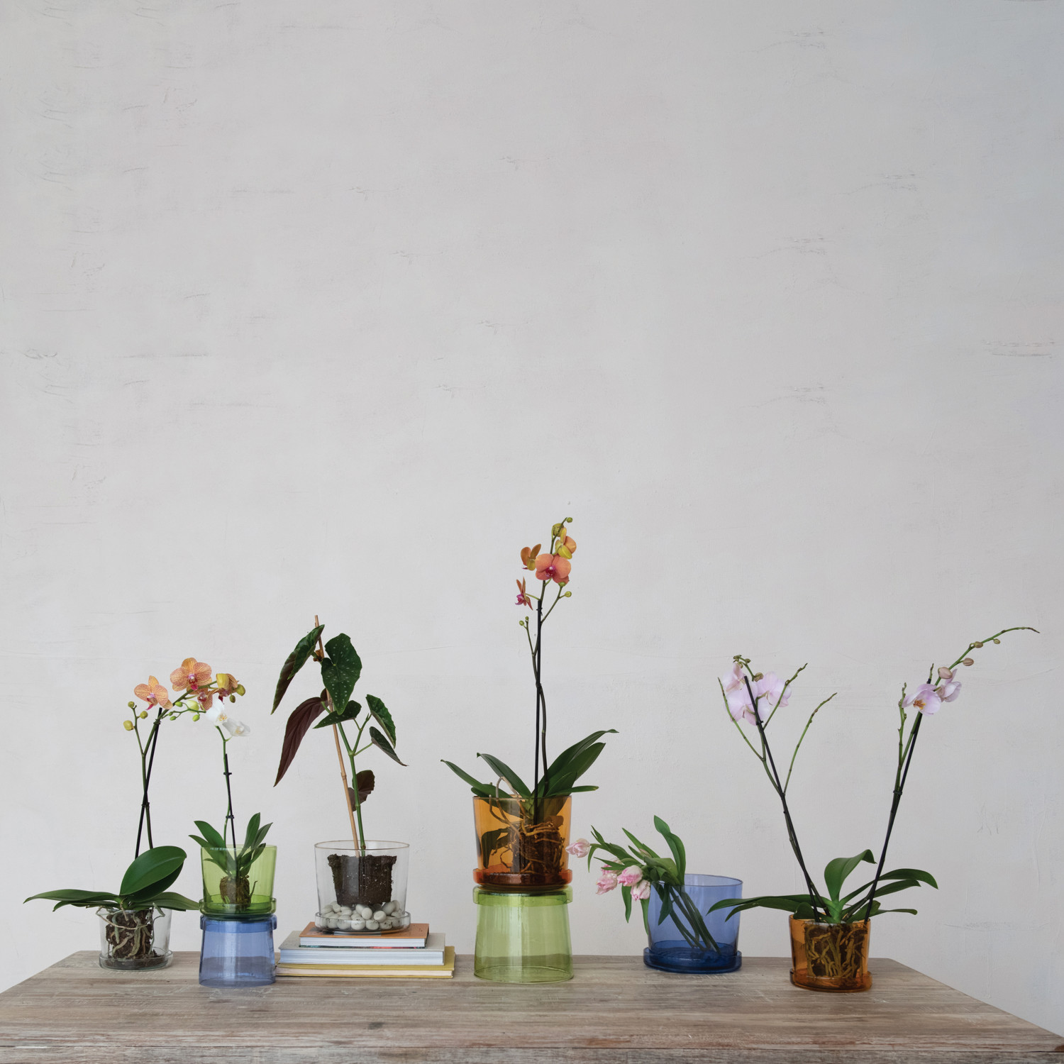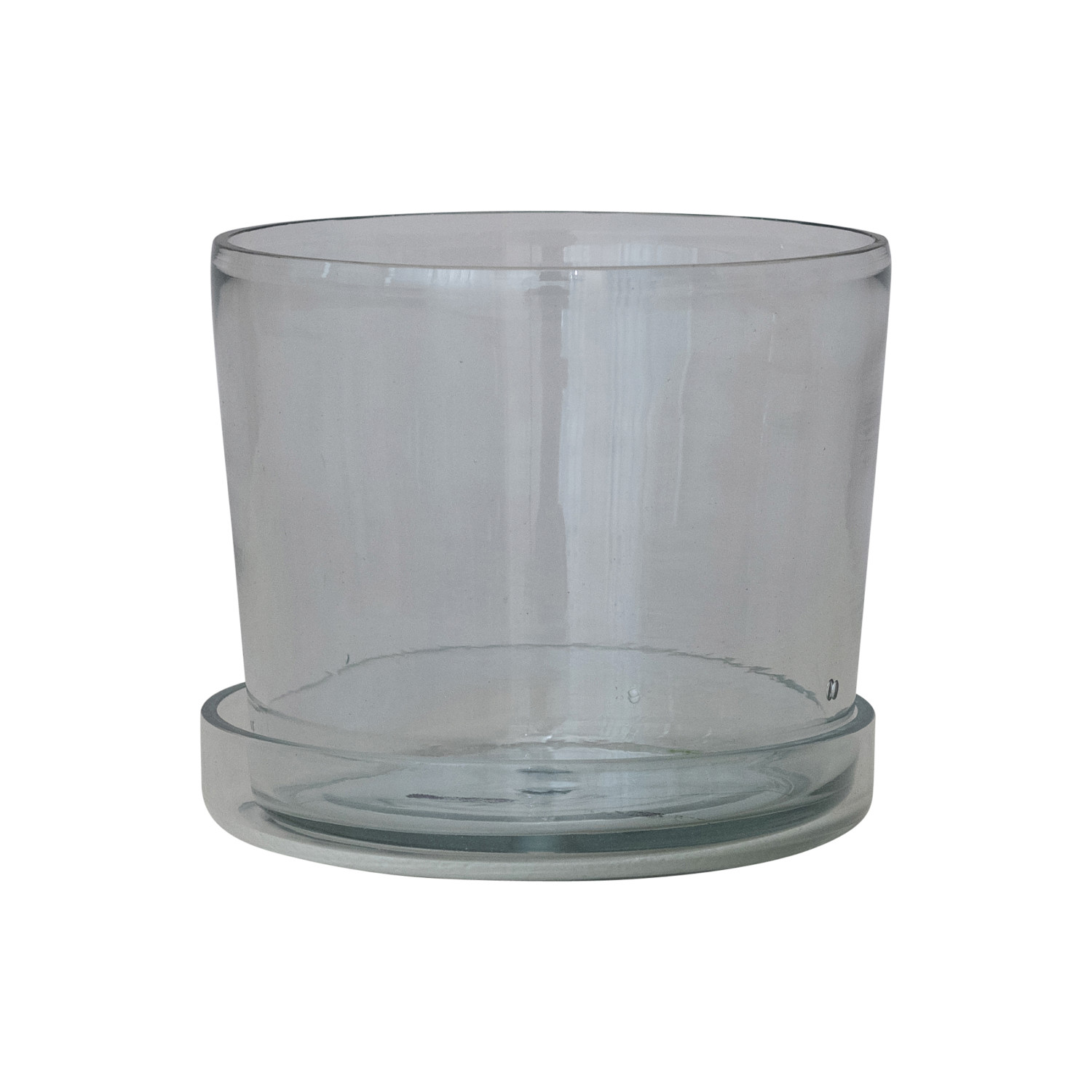 Hand-Blown Recycled Glass Planter w/ Drainage Hole & Saucer, Set of 2 (Holds 5" Pot)
