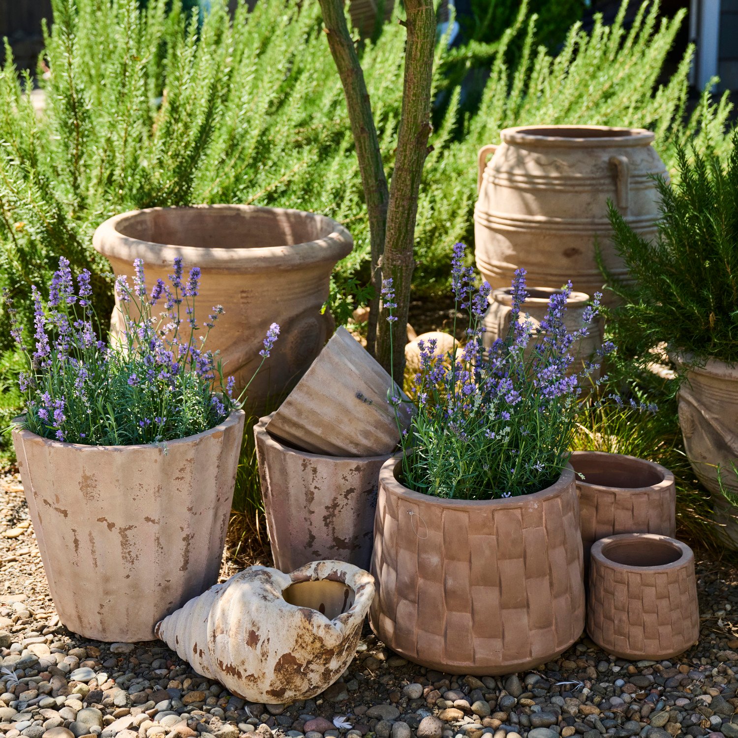 Catalog Name: Terra-cotta Pot Pallet: Includes 8 Sets of Pots & 4 Shell Shaped Planters, Truck Ship (Each One Will Vary) (24 Individual Pieces)
