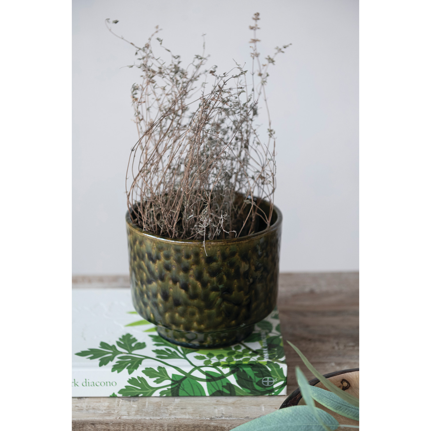 Catalog Name: 6-1/2" Round x 5-1/2"H Stoneware Footed Planter, Reactive Glaze, Green (Holds 5" Pot) (Each One Will Vary)