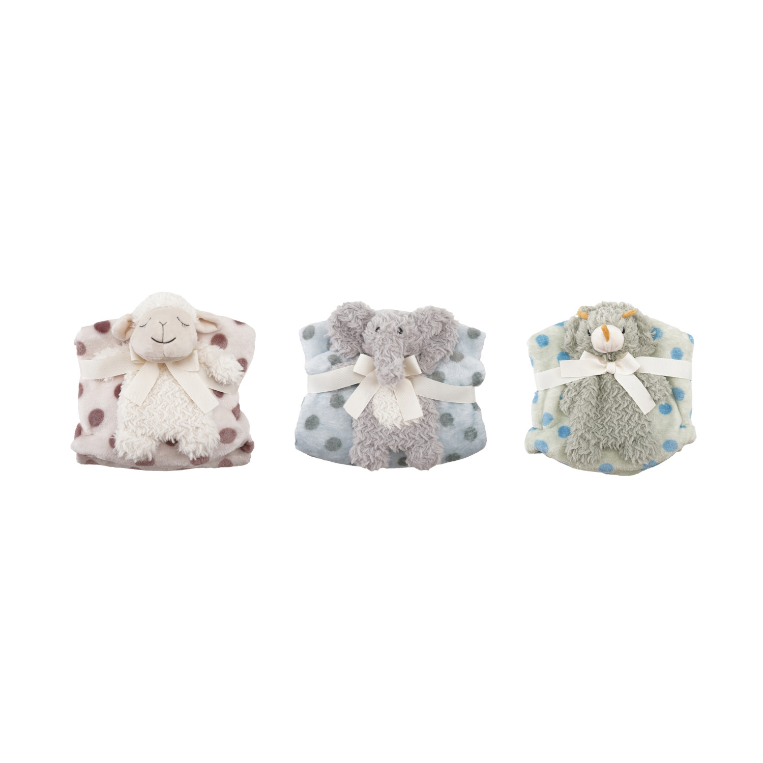 Catalog Name: Approximately 9"L x 2"W x 7"H Plush Animal w/ 29-1/2" Square Polka Dot Blanket, Multi Color, Set of 2 Tied w/ Cotton Tape, 3 Styles