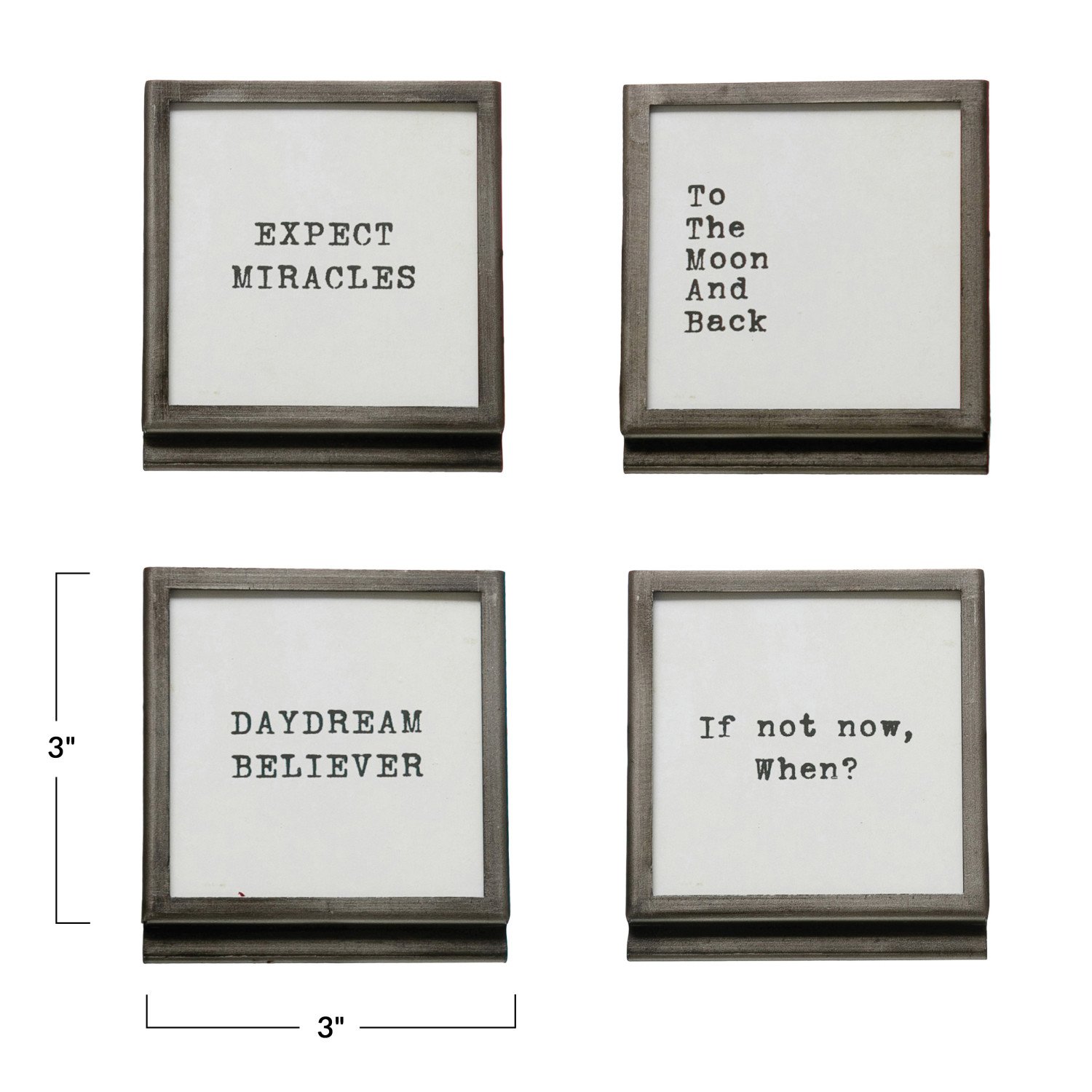 Catalog Name: 3" Square Metal & Glass Frame w/ Easel & Saying, Gunmetal Finish, 4 Styles (Holds 3" Square Photo)