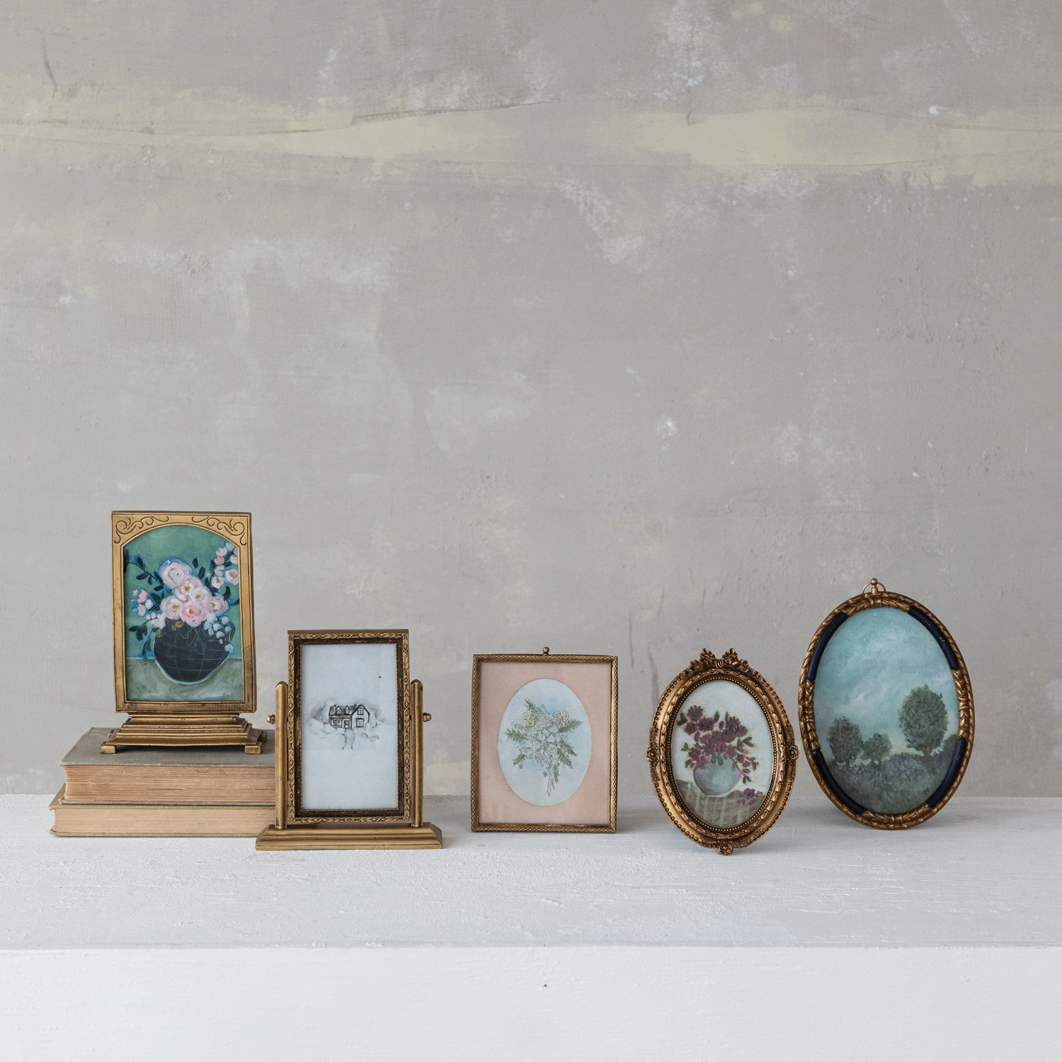 Catalog Name: 4"H - 8"H Pewter & Glass Photo Frames w/ Art, Brass Finish & Multi Color, Set of 6 ©