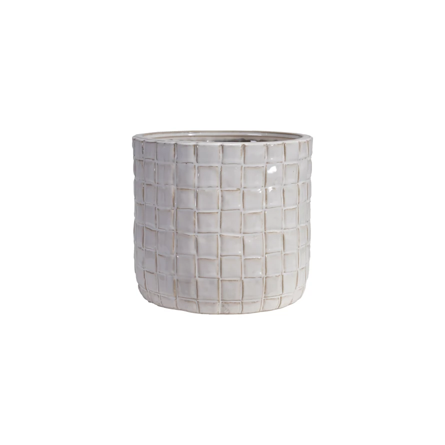 Catalog Name: 9" Round x 7-3/4"H Stoneware Planter w/ Woven Pattern, Reactive Glaze, Cream Color (Holds 7" Pot) (Each One Will Vary)