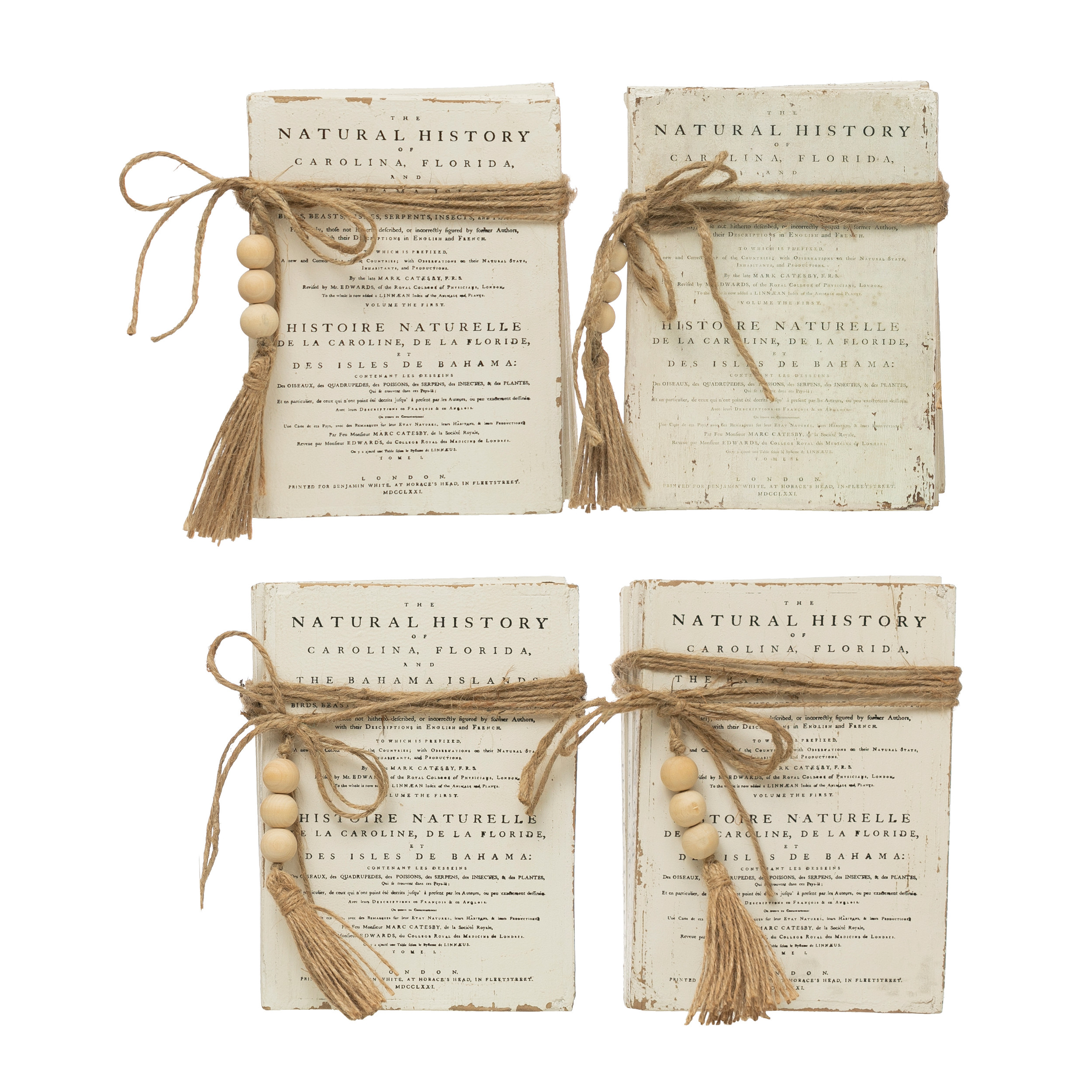 Catalog Name: 8-1/2"L x 6-1/4"W x 3-1/4"H Wood Faux Book Blocks w/ Saying, Wood Beads & Jute Tie, White, 4 Styles