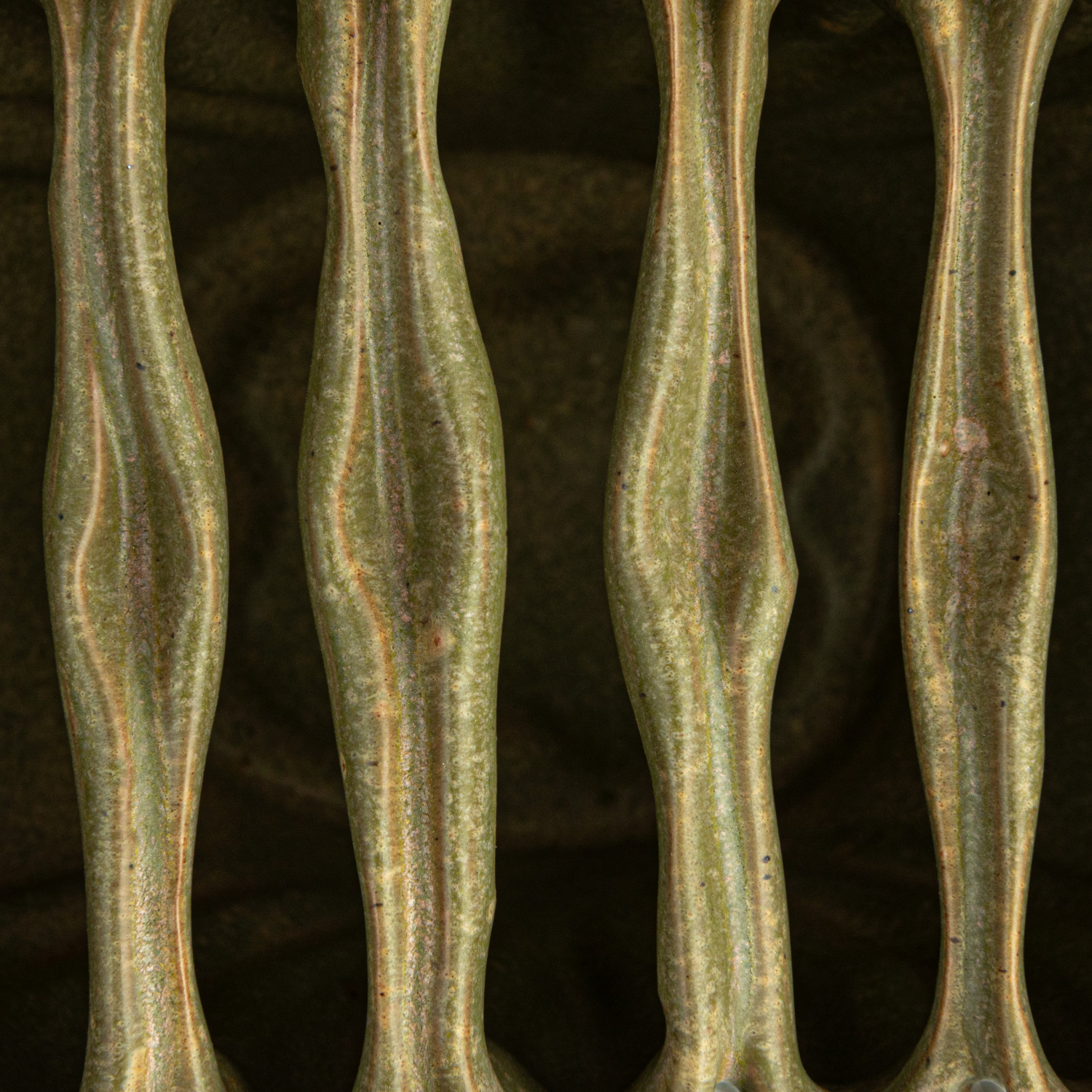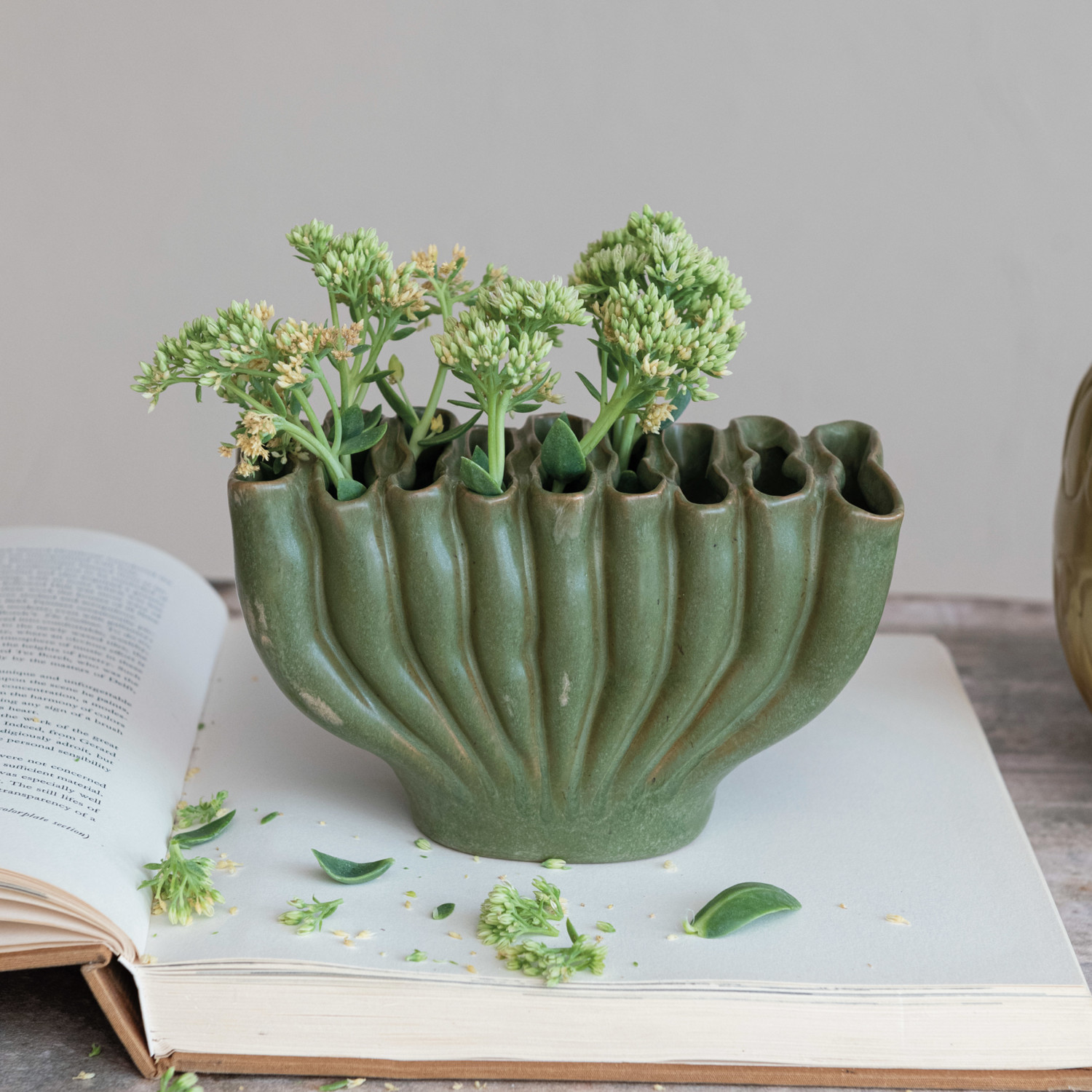 Catalog Name: 8"L x 4"W x 4-3/4"H Stoneware Sculptural Vase w/ 9 Sections, Matte Reactive Glaze, Green (Each One Will Vary)