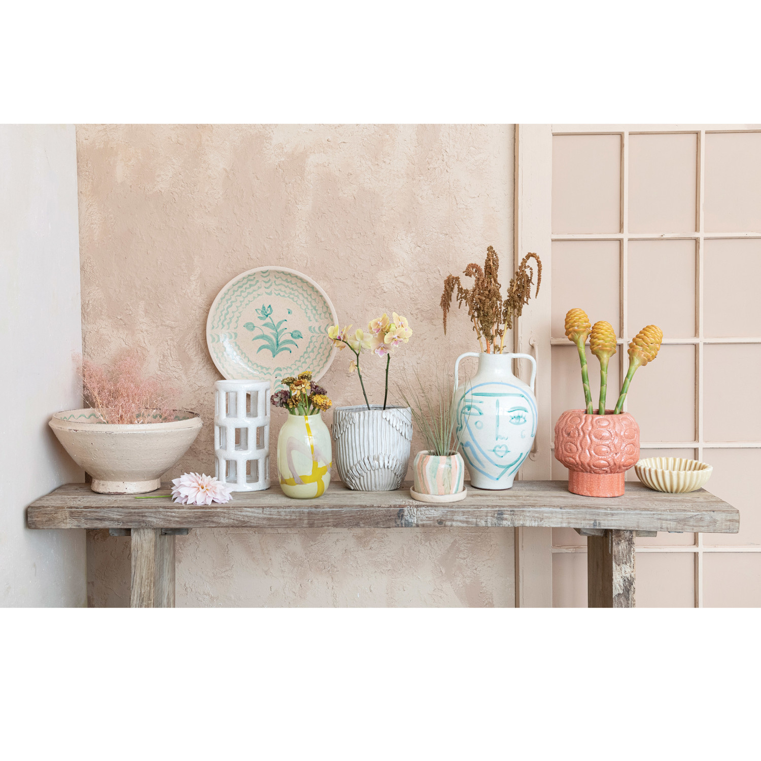 This hand-painted terra-cotta vase features an abstract face and crackle glaze in white, blue, and aqua colors. It is a unique and beautiful home accessory, made of baked clay with a porous and earthy texture. The vase has a round shape and wide opening, and its hand-painted design adds a playful and artistic touch. The crackle glaze creates a glossy surface, while the white, blue, and aqua color scheme adds a cozy and elegant look. This vase can be used to display fresh or artificial flowers, plants, or branches, or as a sculptural accent. Place it on tables, shelves, mantels, or windowsills, and create a cozy and inviting atmosphere in the home. It is suitable for farmhouse, coastal, French country, cottagecore, or boho style and adds personality and charm to any space. Truck shipping is required due to its size and weight.
