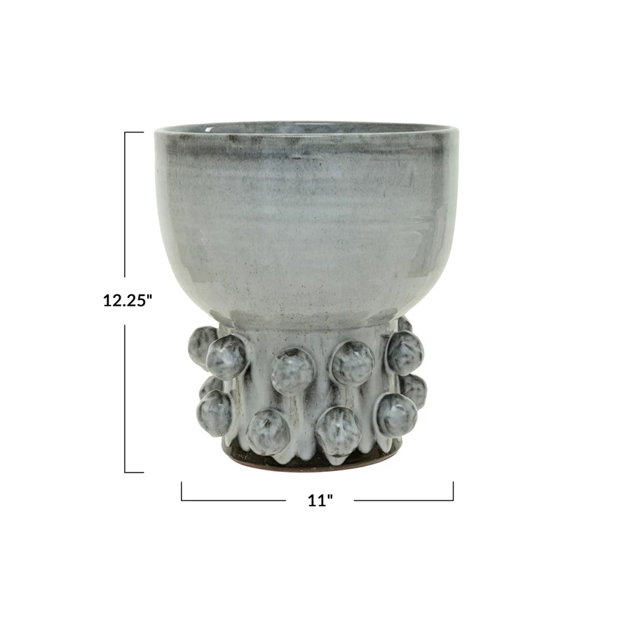 This terra-cotta footed vase with raised dots, white, reactive glaze is a unique and beautiful addition to any home decor. It features a round shape, a glossy finish, and raised dots for dimension. This vase is also ideal for any coastal, beach, farmhouse, French country, or Scandinavian-themed decor, as it adds a touch of texture and elegance. This vase is also perfect for displaying fresh or dried flowers, branches, or greenery, as it creates a stunning and natural look. It is made of terra-cotta, a type of clay that is durable and easy to clean. This vase measures 11 inches in diameter and 12.25 inches in height. This vase is a great gift for anyone.