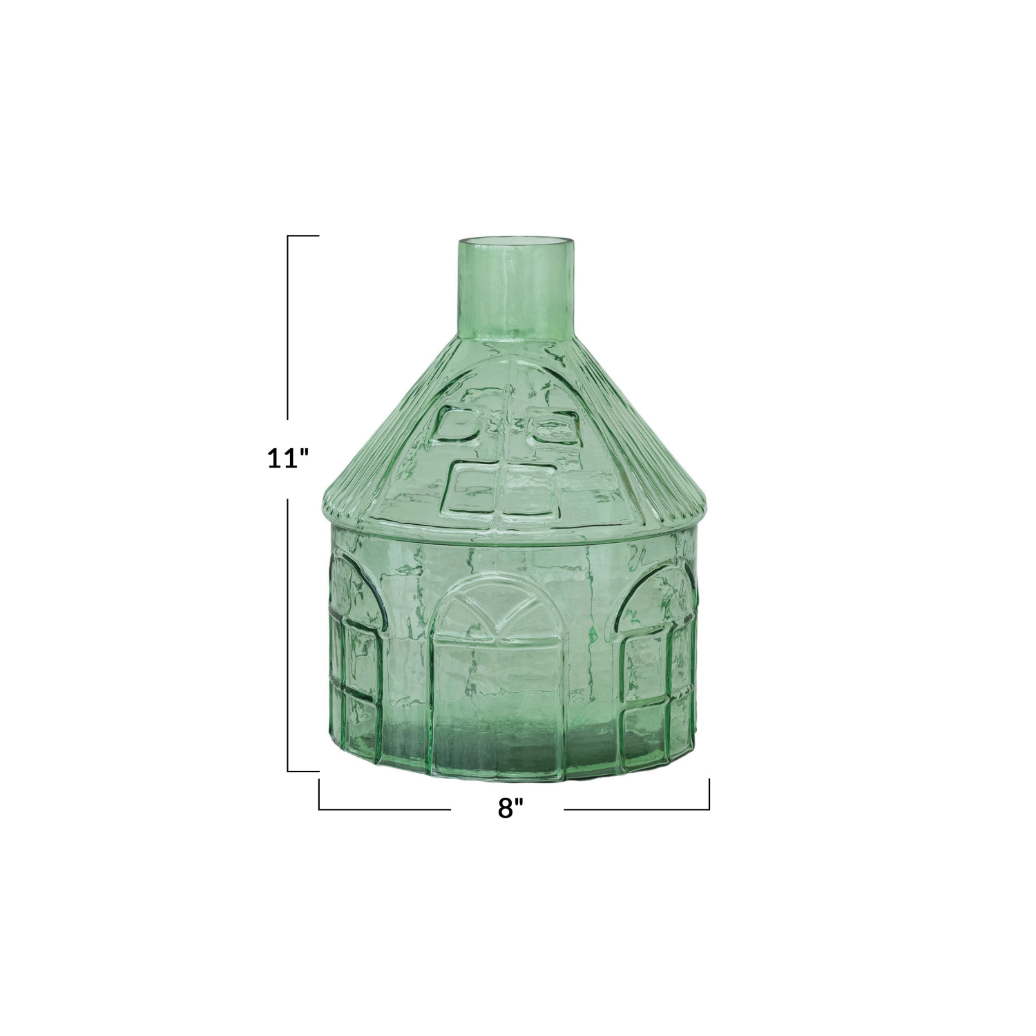 Catalog Name: 8" Round x 11"H Pressed Glass House Shaped Vase, Light Green, Truck Ship