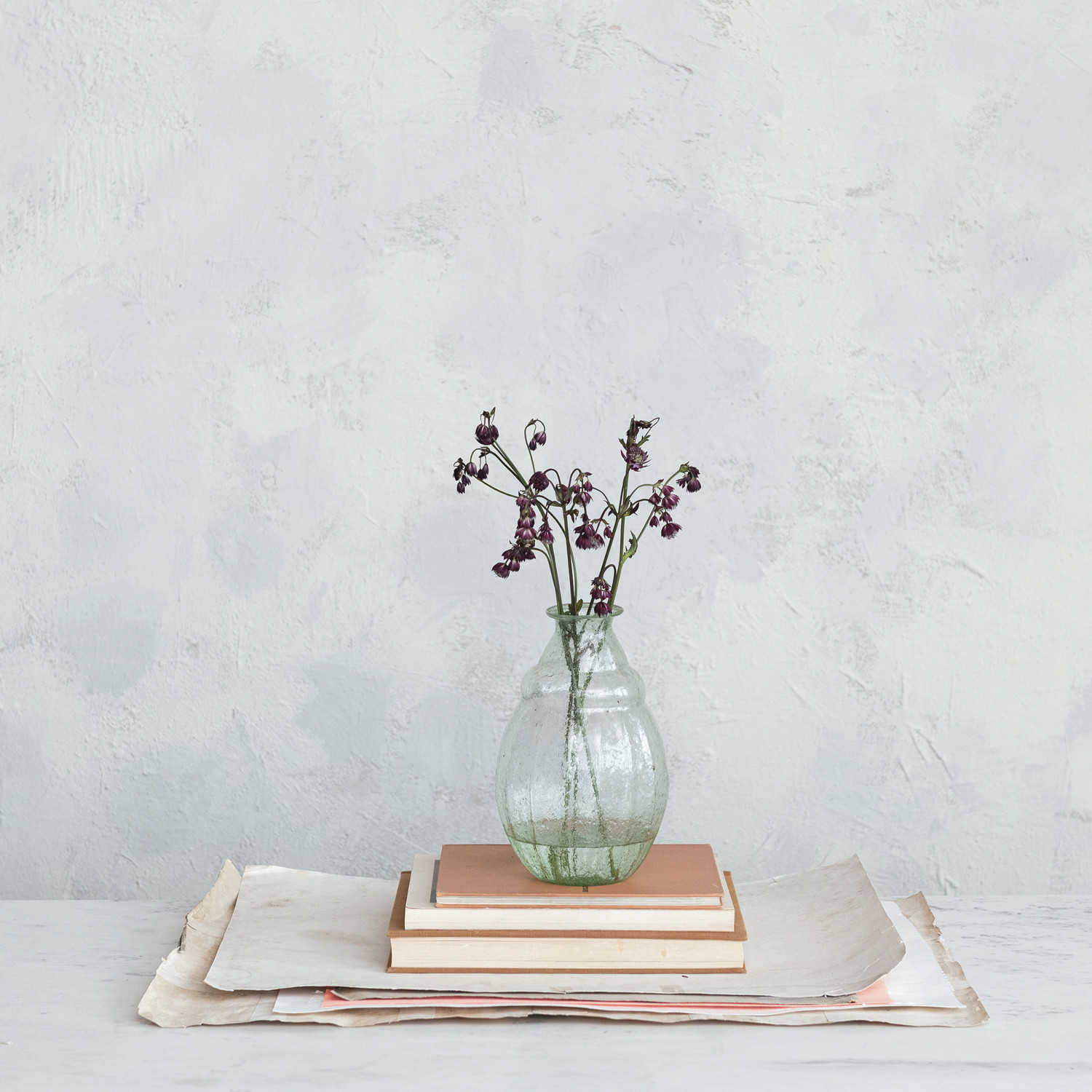 Catalog Name: 6-1/4" Round x 9-3/4"H Hand-Blown Seeded Glass Vase, Green
