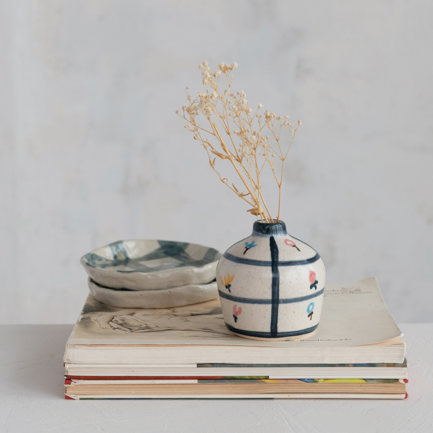 Hand-Painted Terra-cotta Vase w/ Flowers & Grid Pattern, Crackle Glaze (Each One Will Vary)