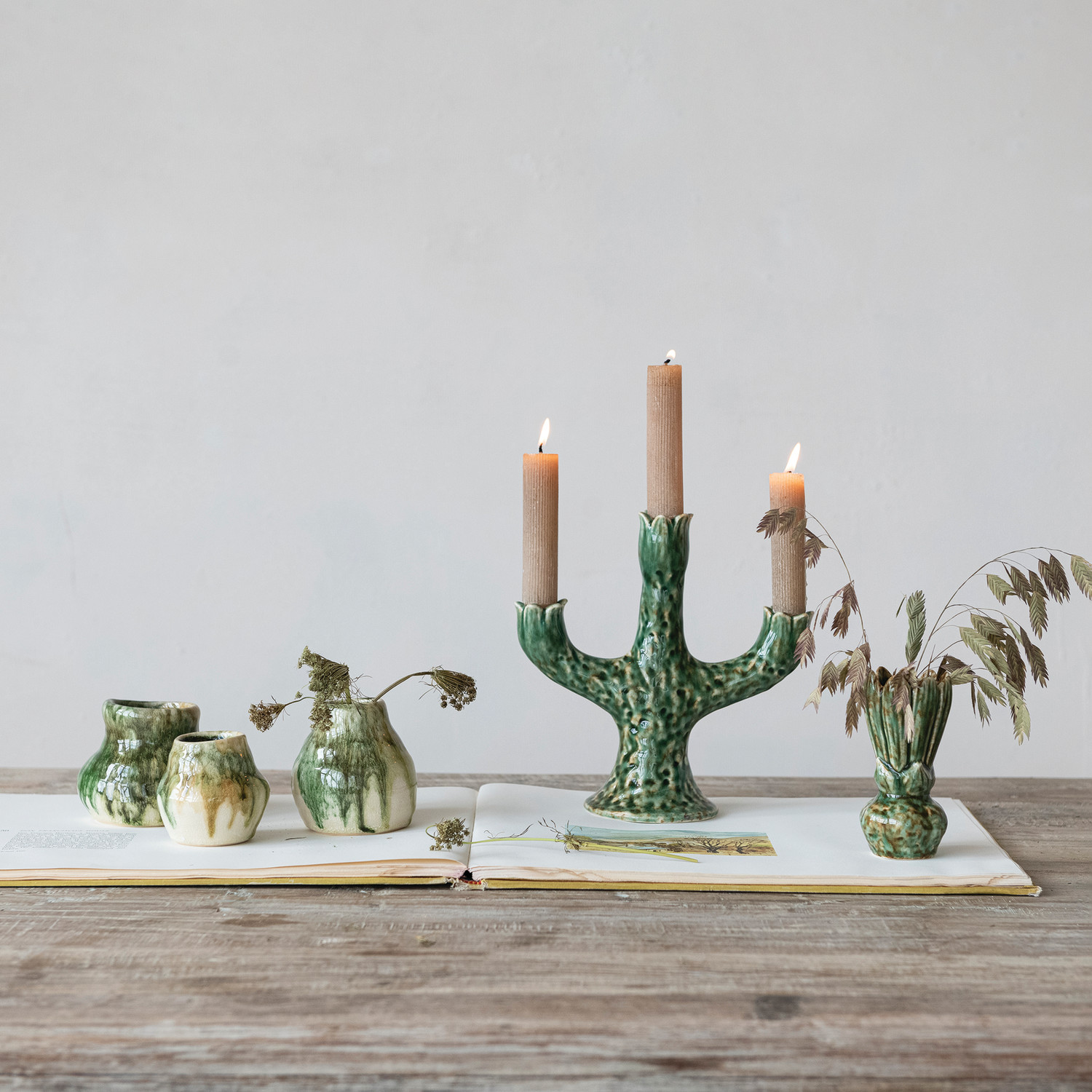 Catalog Name: 2-1/4" Round x 4-3/4"H Stoneware Flower Shaped Vase, Reactive Glaze, Green (Each One Will Vary)